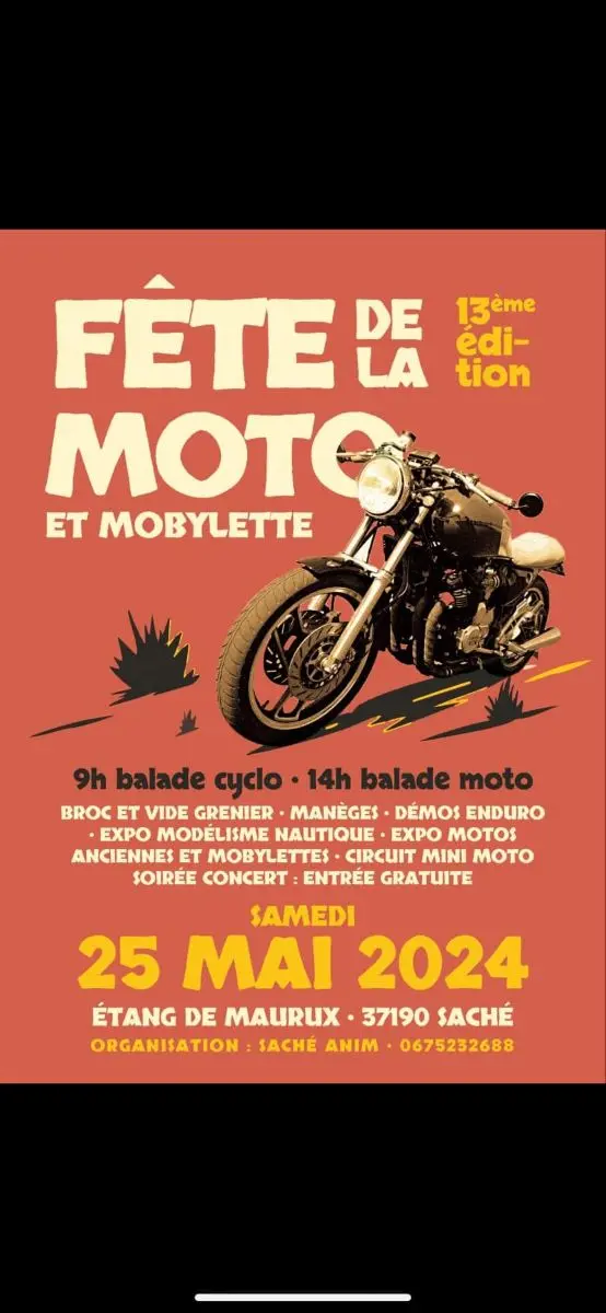 Pour cette 14ème édition de la fête de la moto et de la mobylette l’association « Saché anim’ » vous propose une journée complète autour d’une bonne ambiance avec Restauration et Buvette sur Place. Des balades cyclo à 9h et moto à 14h. Une brocante et vide grenier, des expositions de motos, mobylettes et de modélisme nautique, un circuit mini motos, manège et un concert gratuit en soirée...