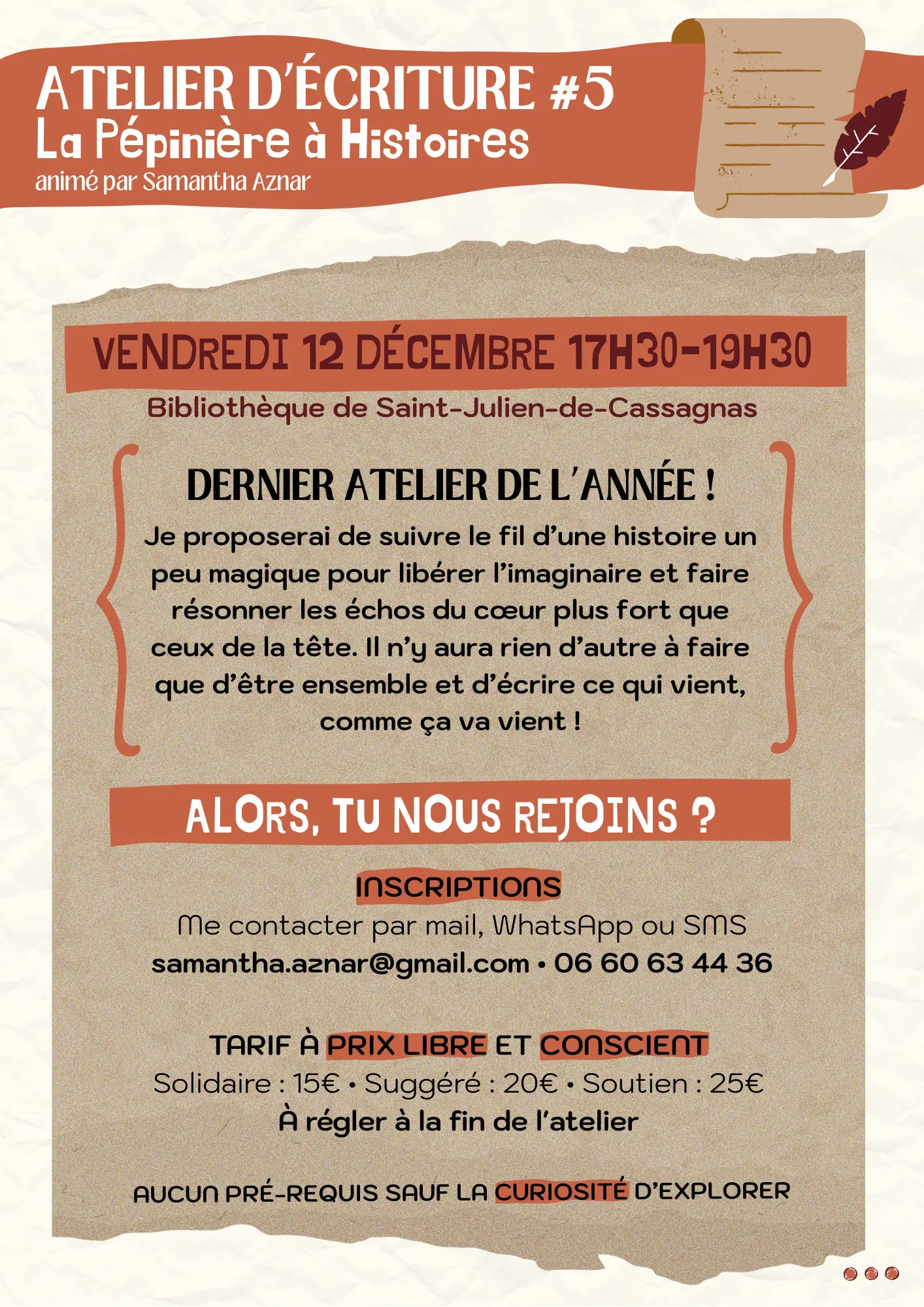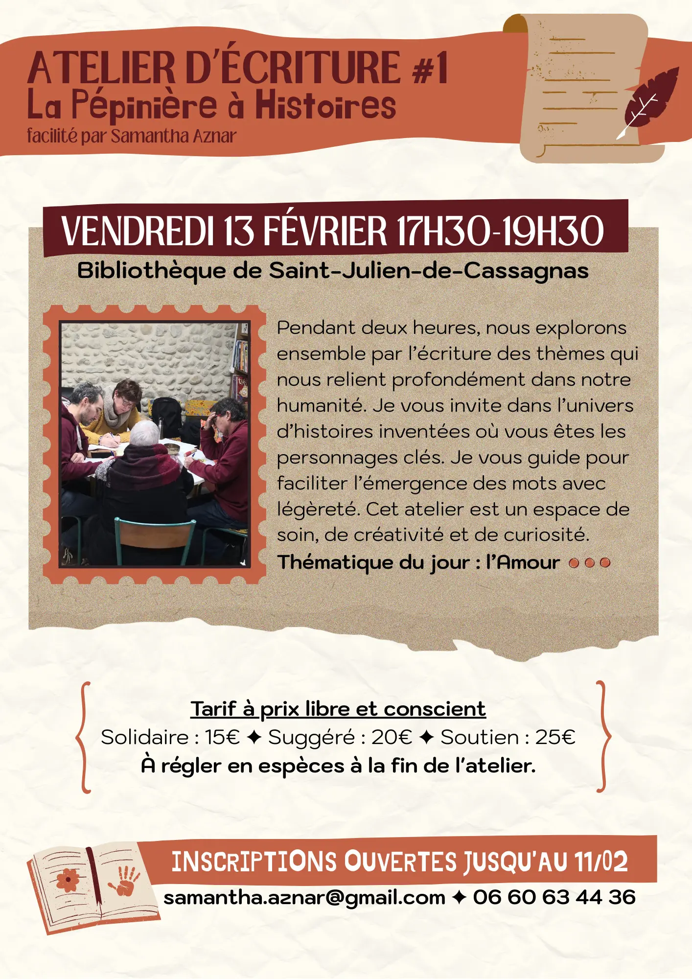 Un tarif à prix libre et conscient sera demandé à la fin de l'atelier ➜ Solidaire : 15€ • Suggéré : 20€ • Soutien : 25€