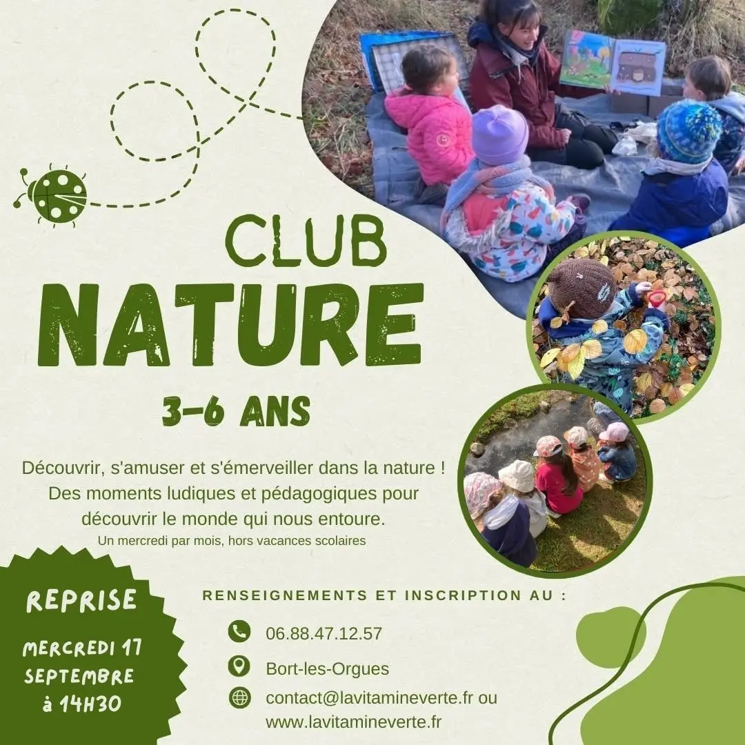 Reprise du club nature 3-6 ans Découvrir, s'amuser et s'émerveiller dans la nature ! Des moments ludiques et pédagogiques pour découvrir le monde qui nous entoure. Construire une cabane, observer les insectes, s’initier au land art ou aux couleurs végétales, le Club Nature est animé par une animatrice nature diplômée et expérimentée, pour entrainer les enfants dans des aventures passionnantes. Si vos enfants souhaitent partager cette envie avec d'autres enfants de leur âge, rejoignez-nous! Renseignements et inscription obligatoire par téléphone au 06.88.47.12.57 ou par mail contact@lavitamineverte.fr en précisant votre nom et prénom, votre numéro de téléphone, l’âge des enfants. Plus d’informations : www.lavitamineverte.fr Places limitées Prévoir une tenue adaptée à la météo, des chaussures de marche ou des baskets, un sac à dos et de l’eau.