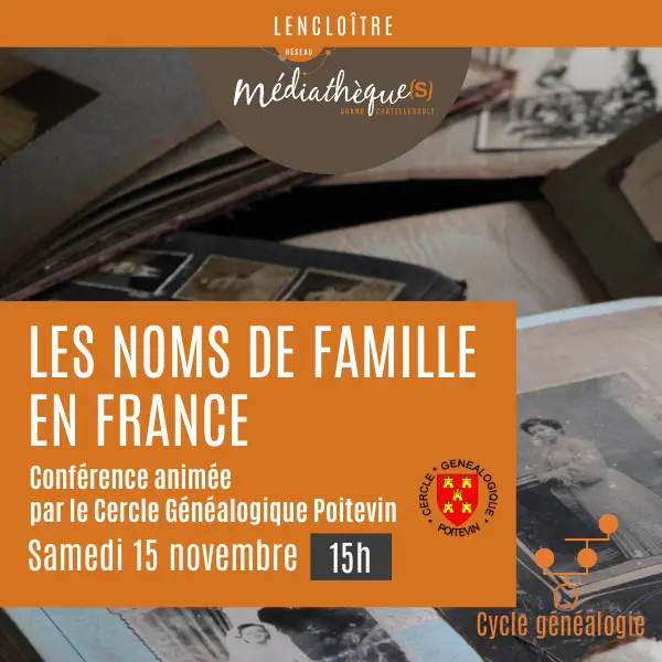 D'où vient votre nom de famille ? Depuis quand a-t-on un nom de famille ?... Découvrez l'origine et la signification des noms de famille en France et quelques anecdotes surprenantes lors de cet atelier animé par le Cercle Généalogique poitevin ! Si vous souhaitez connaître l'origine de votre nom de famille, merci de vous inscrire avant le 8 novembre.