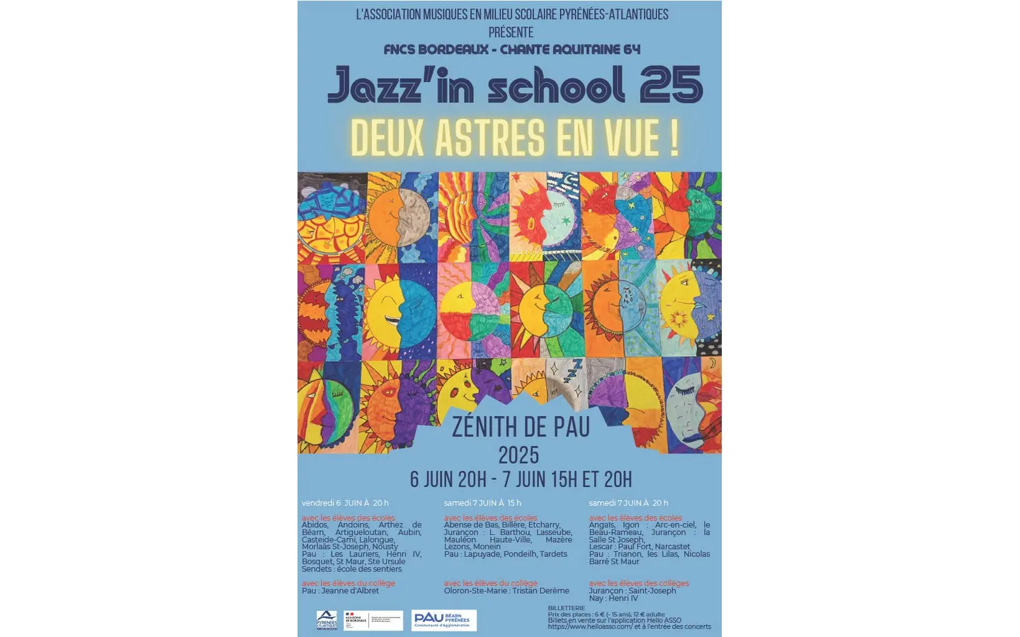 Venez nombreux assister au concert des rencontres chorales scolaires Chante Aquitaine 64 : « Jazz’in school 2025 ». Le spectacle, « Deux astres en vue ! » permettra de mettre à l’honneur l’évocation de la lune et du soleil cités dans des chansons emblématiques du répertoire de la variété française. L’occasion de se rendre compte de l’importance de ces deux astres sur la vie des hommes et sur leurs inspirations ! Les chœurs d’enfants seront accompagnés par des musiciens professionnels.