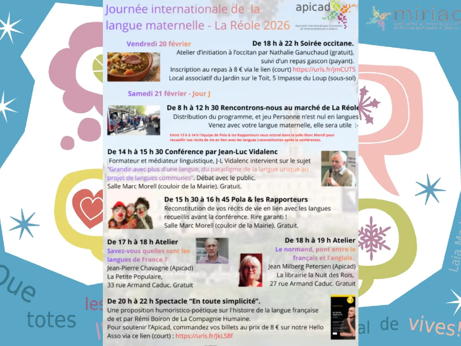 La journée internationale de la langue maternelle de l’Unesco est le 21 février. L’Apicad a saisi l’occasion pour organiser un événement à La Réole sur ce thème. Du vendredi 20 au samedi 21 février 2026 : soirée occitane, ateliers, récits de vie, conférence et spectacle autour des langues maternelles. Nous avons recours à des intervenants locaux et extérieurs, et nous pensons toucher une centaine de personnes par la diversité des activités proposées. Notre but est de sensibiliser le public à la valeur de la compréhension. En effet, il n’est pas nécessaire de parler une langue pour la comprendre et personne n’est nul en langues puisque chacun peut mobiliser des connaissances partielles et diverses, pour comprendre et interagir. Rendez-vous sur notre page HelloAsso pour réserver vos billets pour le repas et le spectacle.