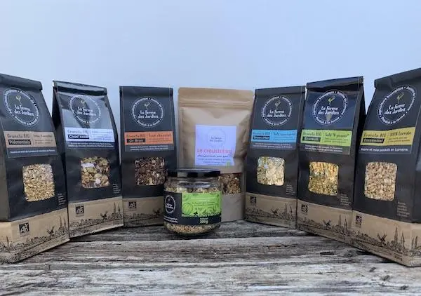 Agriculteur à Liocourt depuis plusieurs générations et associé désormais, la Ferme des Jardins a fait sa conversion en agriculture Bio en 2015. Nous y produisons des céréales et notamment de l'avoine qui est la base de nos granolas artisanaux. Toutes les matières premières proviennent prioritairement de Lorraine et sont issues de l'agriculture biologique. Les produits sont réalisés sans additifs, conservateurs, adjuvants ou graisse de palme.