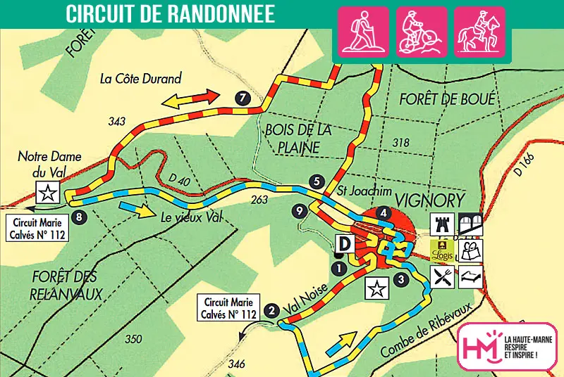 Entre sentiers historiques, forêt et patrimoine roman : Ce circuit de 11 km au départ de la mairie de Vignory est une belle invitation à conjuguer marche active et immersion dans un patrimoine médiéval d’exception. Le parcours débute dans les ruelles typiques du village, passe devant le magnifique lavoir du XIXe siècle, grimpe vers les vestiges du château féodal, construit au début du 11ème et remanié jusqu'au 18ème, puis traverse le jardin médiéval avant de rejoindre la forêt de l’Étoile. Les randonneurs découvrent des panoramas remarquables sur la vallée de la Marne et la Côte des Bars. Le chemin serpente ensuite entre sous-bois, plateaux agricoles et curiosités locales : chapelle du Val, ancien four à chaux, points d’interprétation, église romane Saint-Étienne (plus ancienne église romane du nord-est de la France vaut également le détour). Balisé en bleu-jaune et jaune-rouge, le circuit (environ 3h à pied) propose une variété de terrains et de paysages, accessible aux randonneurs réguliers comme aux curieux d’histoire et de nature. Une boucle harmonieuse à vivre à son rythme.