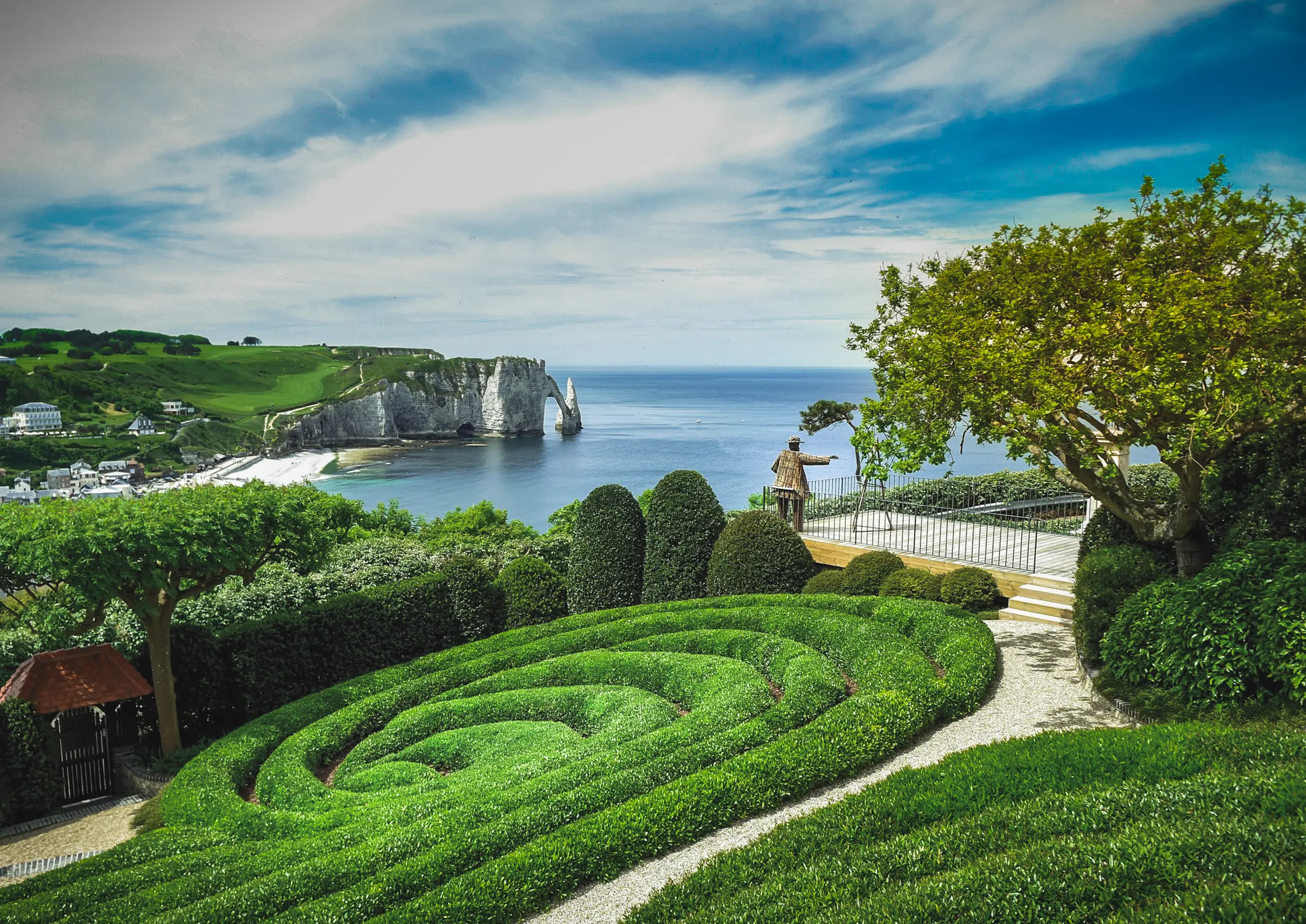 Les Jardins d’Étretat… Un endroit magique sur la Falaise d’Amont, avec une vue exceptionnelle sur la fameuse Aiguille. Mêlant poétiquement art paysager et sculptures, les jardins semblent être là depuis toujours. Il ravira aussi bien les amateurs de topiaires et les amoureux des paysages de l’impressionnisme que les admirateurs d’art contemporain. Créés par l’architecte paysager Alexandre Grivko, les jardins, à la fois, extraordinaires et surprenants s’inscrivent complètement dans la nature environnante. Les sculptures végétales ainsi créées sont des tableaux de verdure aux étendues infinies s’avançant vers la mer, invitant plus que jamais à la contemplation.