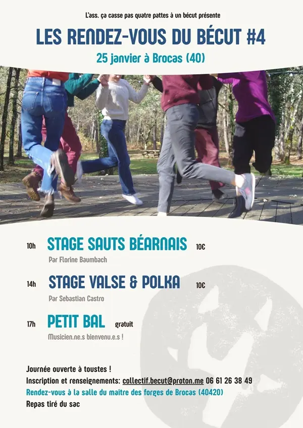 Journée ouverte à toustes ! Au programme: Stage sauts béarnais Par Florine Baumbach 10h - 10€ Repas tiré du sac - 12h Stage valse & polka Par Sebastian Castro 14h - 10€ petit bal 17h - gratuit