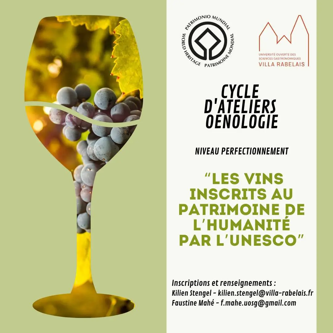 Il n'existe pas de vin inscrit à part entière sur la liste du patrimoine mondial de l'UNESCO. C'est bien le terroir, le savoir-faire viti-vinicole et le paysage culturel qui sont reconnus, et non le vin en lui-même. Le Val de Loire viticole en est un bel exemple. C'est l'ensemble du vignoble, des châteaux viticoles, des jardins de vignes et des paysages viticoles qui ont été inscrits en 2000. C'est donc une véritable expérience à vivre que de profiter de cette programmation de dégustations, inscrite dans l’offre de l’université ouverte des sciences gastronomiques au sein de la Villa Rabelais, où le vin est indissociable du patrimoine historique et culturel.Ce cycle s’adresse à celles et ceux qui souhaitent approfondir leurs connaissances du vin et de son univers. Cette formation est destinée à tous les publics et n’est pas réservée aux connaisseurs avertis.