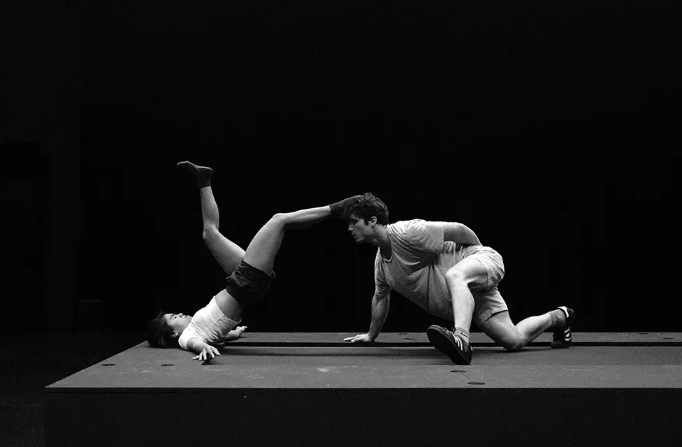 Sur un tapis roulant, la gravité vacille, le temps s’étire, et les corps dansent l’instabilité du temps qui passe. Trente minutes suspendues où vitesse et équilibre se négocient. L’amitié s’éprouve, l’amour se réinvente, le réel se déconstruit. Rien n’est figé… Et la discipline première de la compagnie, le mains à mains est par la même convoquée de façon inattendue et surprenante.