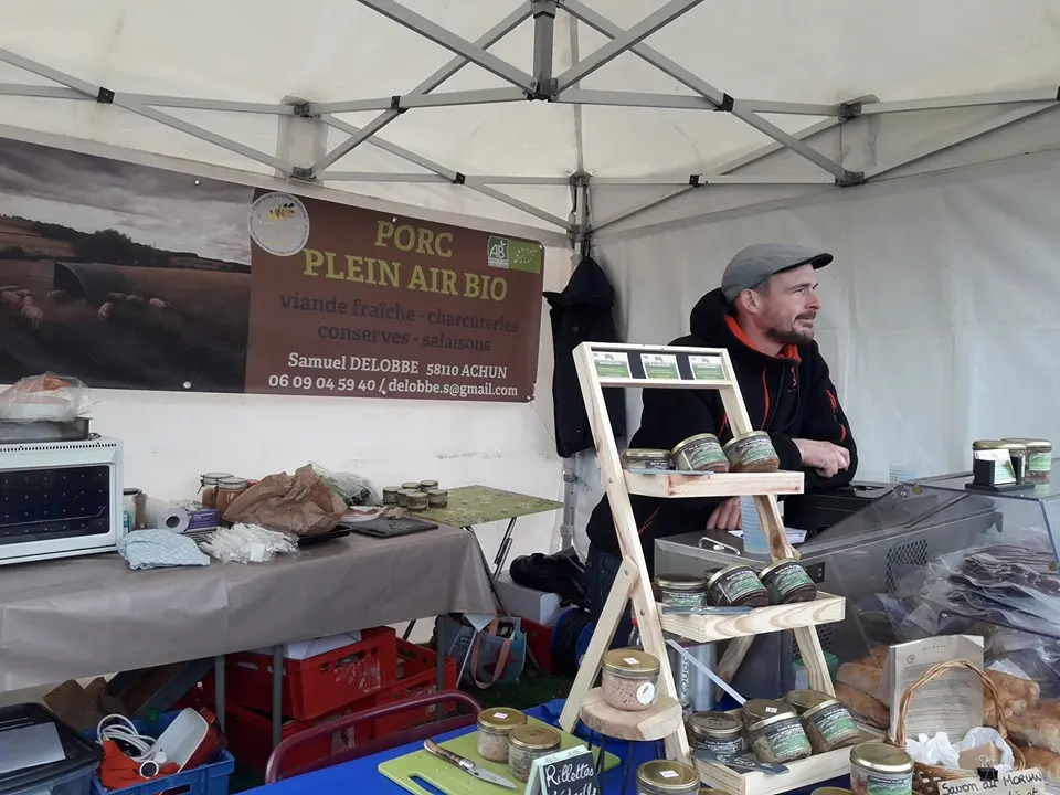Parti de la Nièvre à ses 18 ans pour ses études et le travail, Samuel Delobbe de retour à sa terre natale pour reprendre la ferme familiale (100 Ha de terre Bio et cheptel ovin), sur la commune d'Achun, dans le Bazois (dans le département de la Nièvre en Bourgogne). Passionné par le cochon et la transformation de la viande en général, il a décidé de se lancer dans la production de porcs Bio, dans un objectif de transformation et de vente directe. Il propose des caissettes d'un minimum de 5kg, de différents morceaux de viande fraîche (chipolatas, boudin, saucisson à l'ail), pour un prix de 14€ le kg (environ 70€ la caissette). Le tout est emballé sous-vide. Les produits charcutiers sont confectionnés par ses soins, sans colorant, ni conservateur ni sel nitrité.