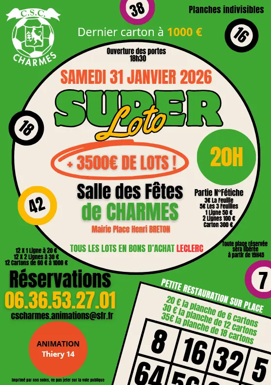 20 Euros la planche de 6 cartons 30 Euros la planche de 12 cartons 35 Euros la planche de 18 cartons 3500 Euros de lots en bons d'achat LECLERC, dernière partie à 1000 Euros Planches indivisibles Partie fétiche Petite restauration sur place