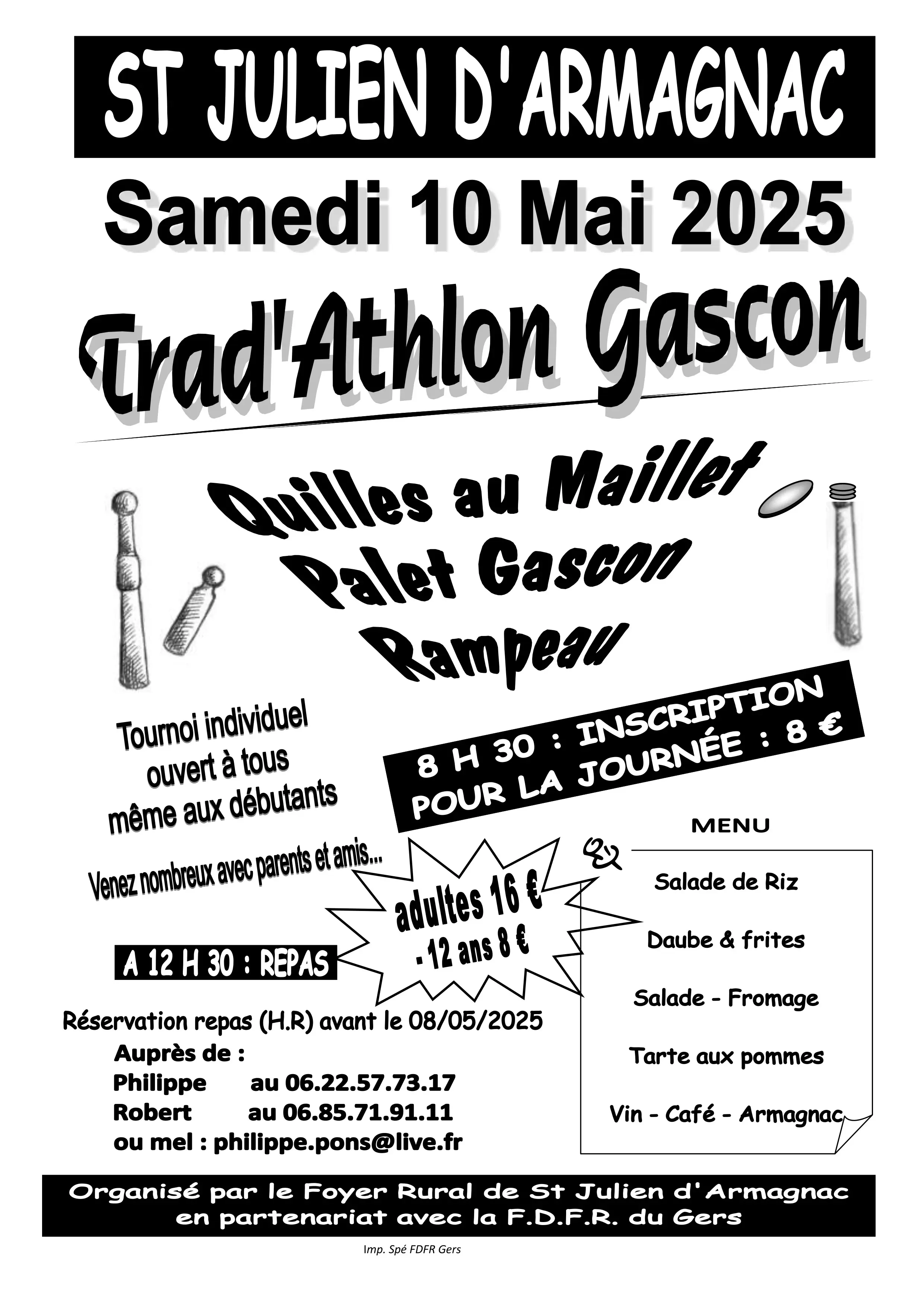 Quilles gasconnes, rampeau ou palet gascon, si ces noms ne vous disent rien alors rendez-vous à partir de 9h pour découvrir ces jeux traditionnels gascon et bien plus encore ! Les gourmands en profiteront pour s'inscrire avant le 8 Mai pour le repas. Au menu : Salade de riz | Daube et frites | Salade | Fromage | Tarte aux pommes | Vin | Café | Armagnac.