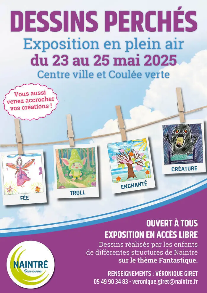 Nouvelle exposition de dessins d’enfants intitulée "Dessins perchés" dont l'objectif est de valoriser l'expression artistique des enfants et de dynamiser le centre ville de Naintré par la même occasion auprès du public.