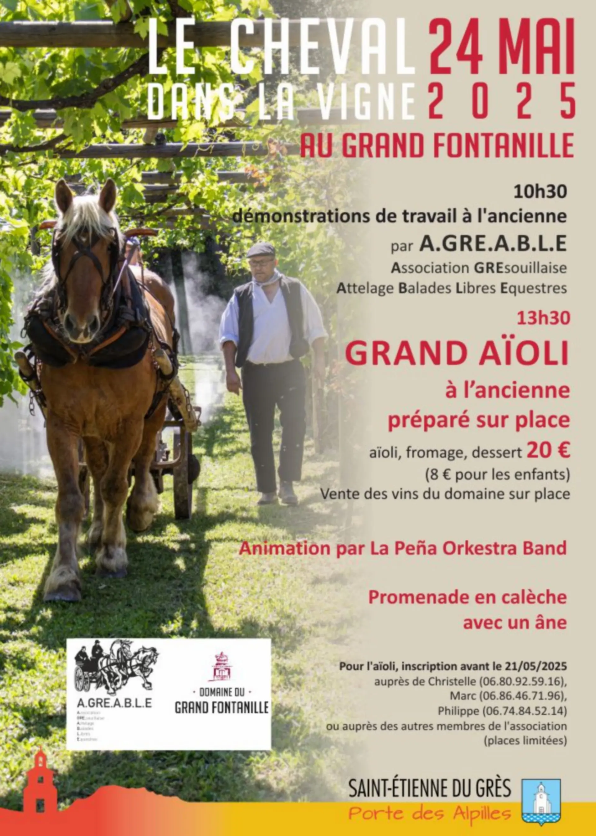 L'Association Grésouillaise Attelage Balade Libres Equestres vous propose à partir de 10h30 entre les vignes et les oliviers des démonstrations de travail à l'ancienne suivies de son Grand Aïoli. Pour l'aïoli, inscription à faire avant le 21 mai 2025