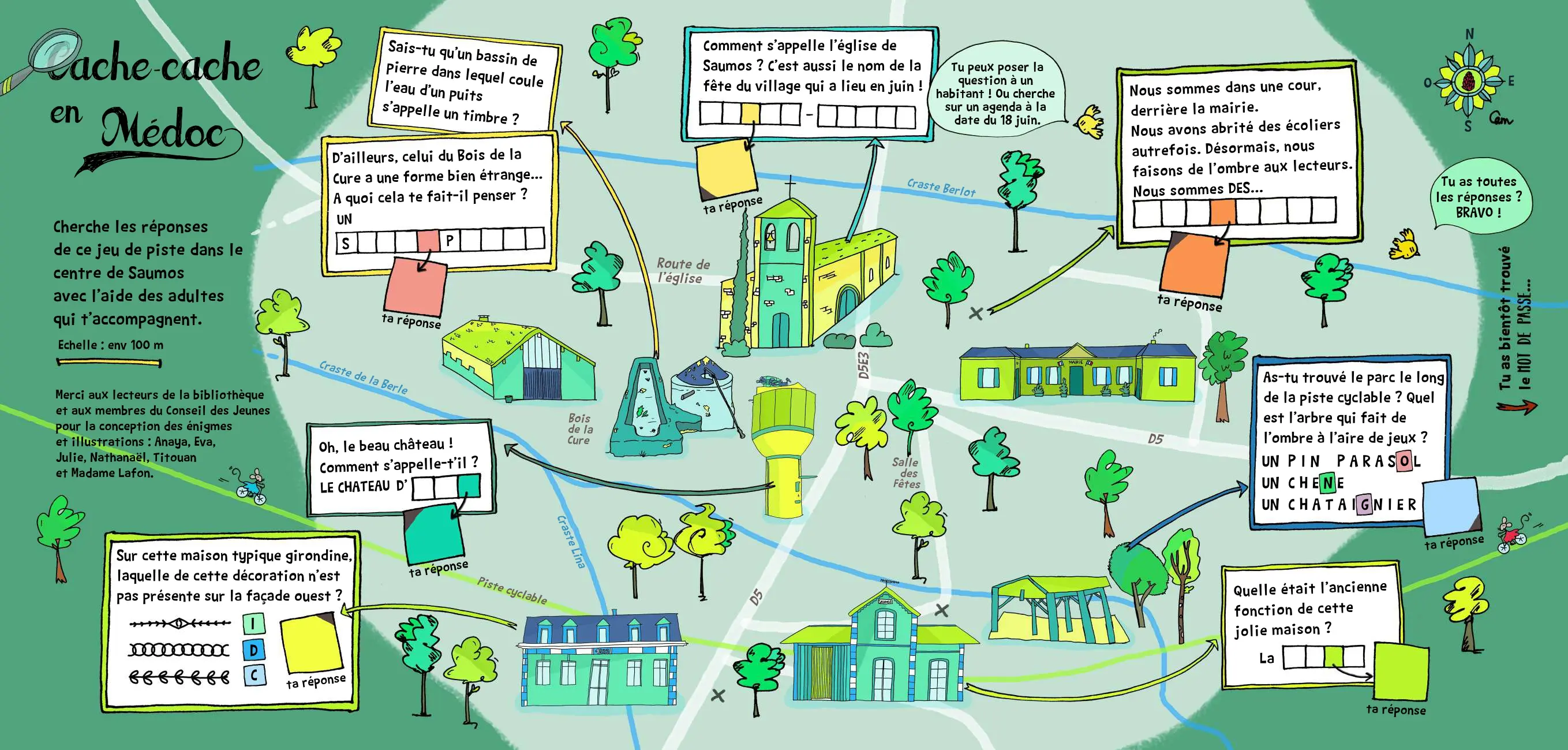 Cache-cache en Médoc est un jeu de piste familial. À vélo ou en voiture, résolvez les énigmes à travers la commune de Saumos et découvrez des lieux phares ! En passant par l’église dans le centre du village, la bibliothéque, la croix , l'ancienne maison et l'église.... Lorsque vous aurez trouvé les énigmes et le mot de passe, nous vous donnons rendez-vous à l'Office de Tourisme, à la Mairie ou à la bibliothèque pour venir chercher votre surprise. A vous de jouer !