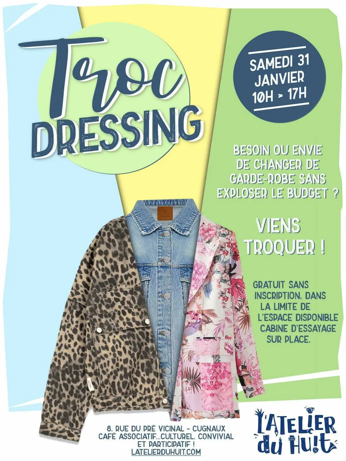 Inédit à l'atelier, le système du troc dressing...vous venez avec quelques vêtements à troquer et vous les échangez comme bon vous semble...c'est gratuit, sans inscription (ouverture à 10h !) et dans la limite de l'espace disponible. Portants autorisés, cabines d'essayage sur place.