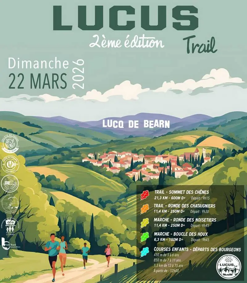 Inscription courses enfants/marche. Remise des dossards. 09h15 : Départ trail 21,3km. Parcours technique début accessible à partir du 13km plus technique, belles vues sur la chaine des Pyrénées et le village en sous-bois de manière générale. 9h30 : Départ trail 11,4km. Parcours accessible pour découvrir le trail. Passage en sous-bois et une vue magnifique sur la chaîne des Pyrénées. 9h45 : Départ des marches de 11,4km et 6,3km. Petit parcours très accessible et familiale allant dans les sous bois et sur les côteaux. A partir de 12h : Courses des enfants.