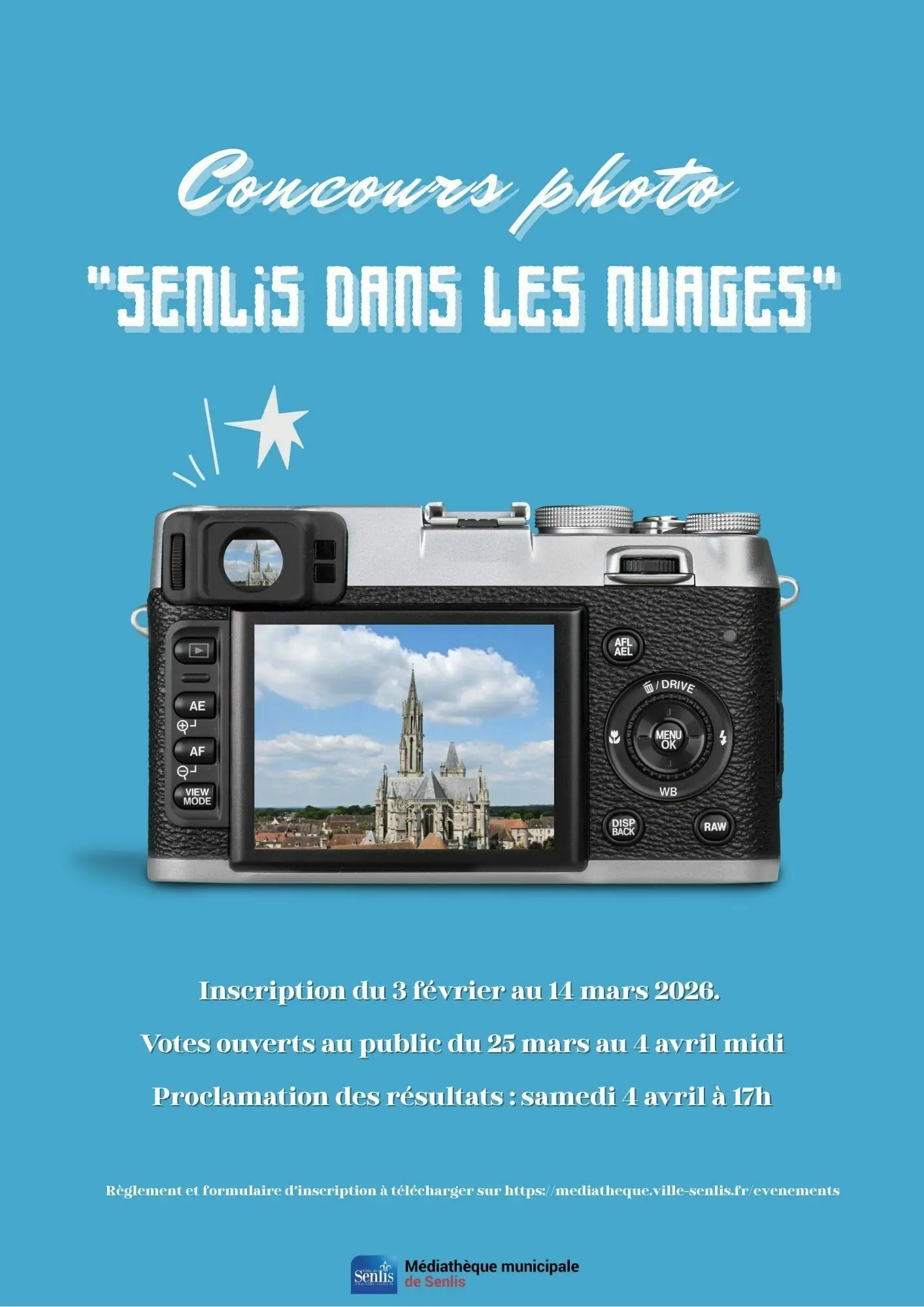 Exposition du 25 mars au 25 avril 2026, des clichés des participants au concours photos "Senlis dans les nuages". Du 25 mars au 4 avril à midi, venez voter pour votre photo préférée. Les résultats seront proclamés à la médiathèque samedi 4 avril à 17h!