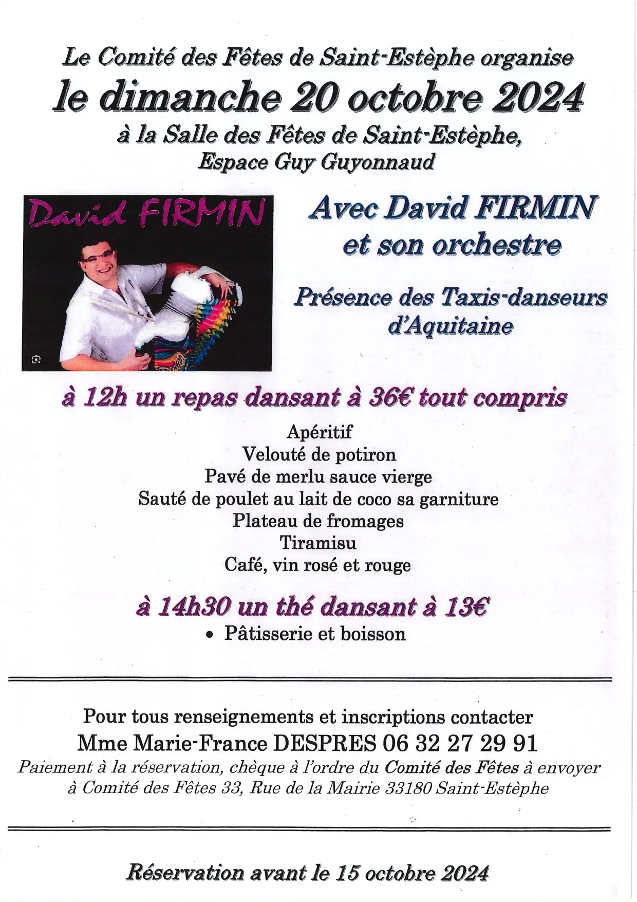 L'Office de Tourisme Médoc-Vignoble vous informe : Le Comité des fêtes de Saint-Estèphe organise un repas dansant à la salle des fêtes. L'ambiance musicale sera assurée Alain Michel, et son orchestre, en présence des taxi-danseurs d'Aquitaine. Au menu : Apéritif ; garbure landaise ; filet de perche au blanc de poireau ; osso bucco de veau et sa garniture ; Vaucluse aux poires ; café, vin rosé et rouge. A partir de 14h30, un thé dansant vous est proposé, avec pâtisserie et boisson. Sur inscription. Le règlement sera demandé à la réservation.