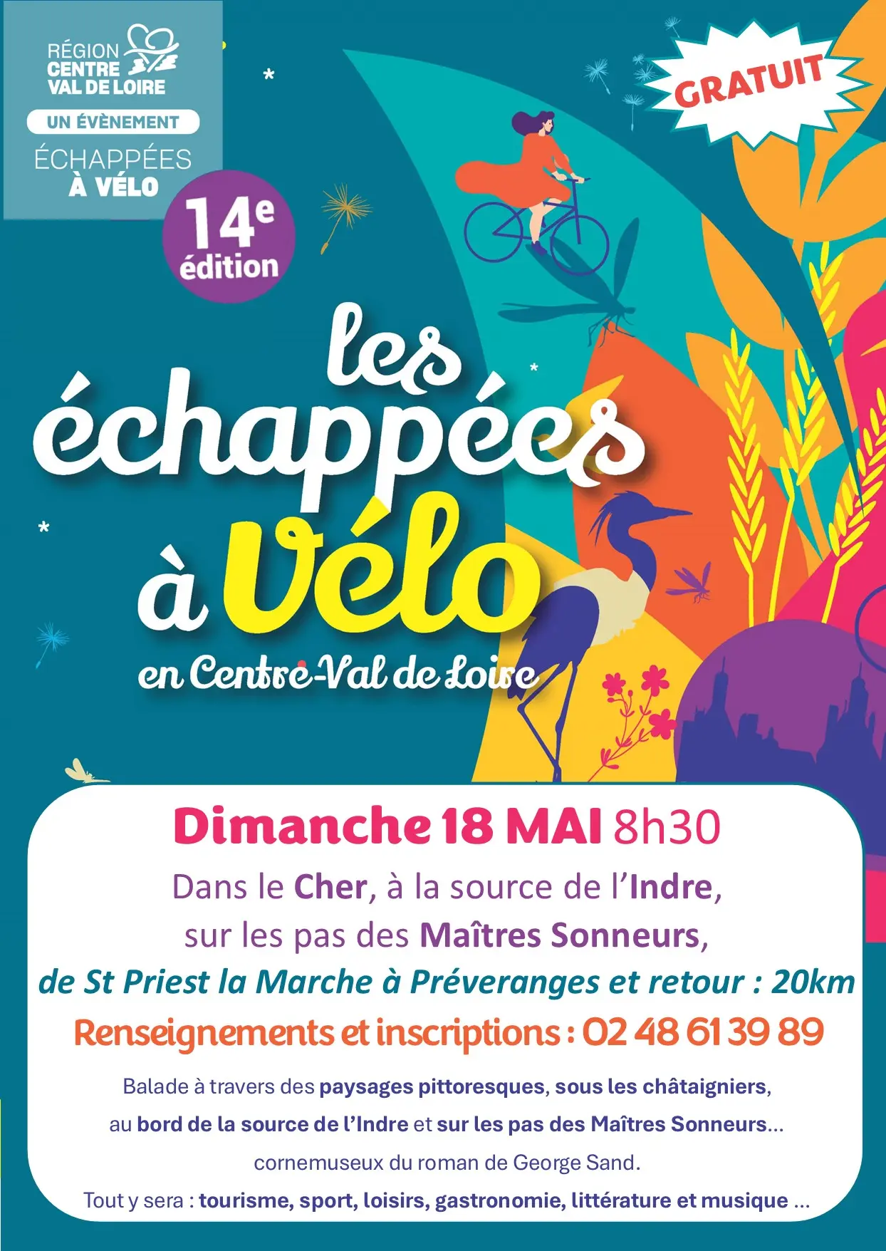 De 8h30 à 12h30, parcours de 20kms. Dans le sud du Cher, en empruntant la V49 "L'Indre à Vélo " devenue « La Cyclo Bohème », nous vous proposons une balade cycliste à travers des paysages pittoresques, sous les châtaigniers, au bord de la source de l’Indre et sur les pas des Maîtres Sonneurs... cornemuseux du roman de George Sand. Tout y sera : tourisme, sport, loisirs, gastronomie, littérature et musique ...Réservation souhaitée au 02.48.61.39.89 gratuit.