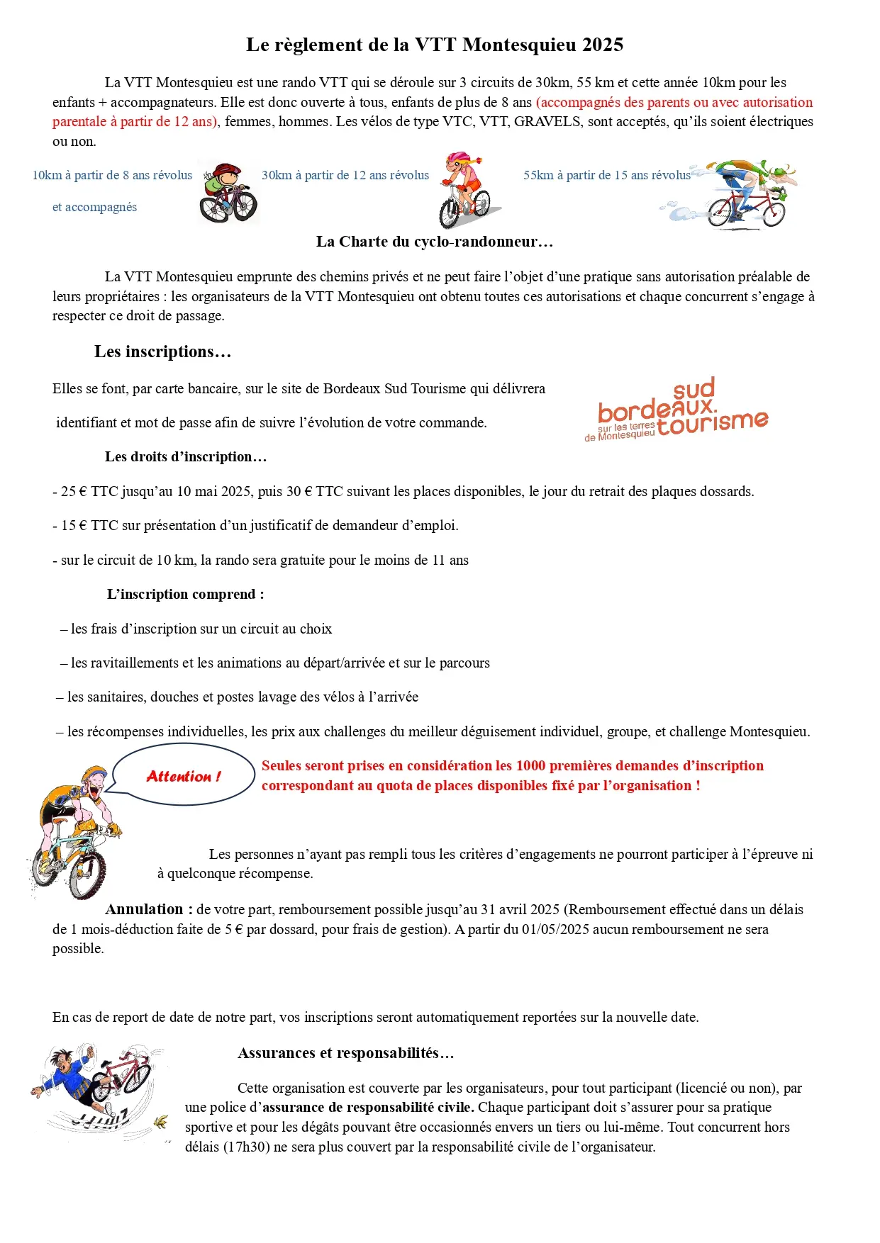La VTT MONTESQUIEU se veut ancrée dans la vie associative locale de la communauté de communes. Au travers d’un événement festif et d’animation du territoire, son objectif est aussi caritatif. Cette année, la VTT MONTESQUIEU soutiendra deux associations qui participent, pour l’une à l’accompagnement de personnes en situation de handicap et pour l’autre à l’accompagnement de personnes en grandes difficultés. Nous espérons que cette deuxième édition sera du meilleur cru.