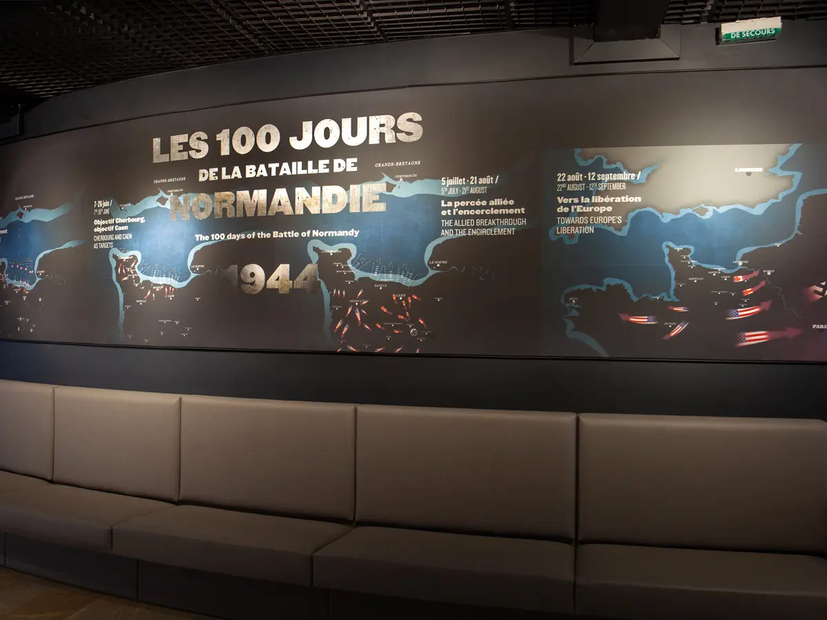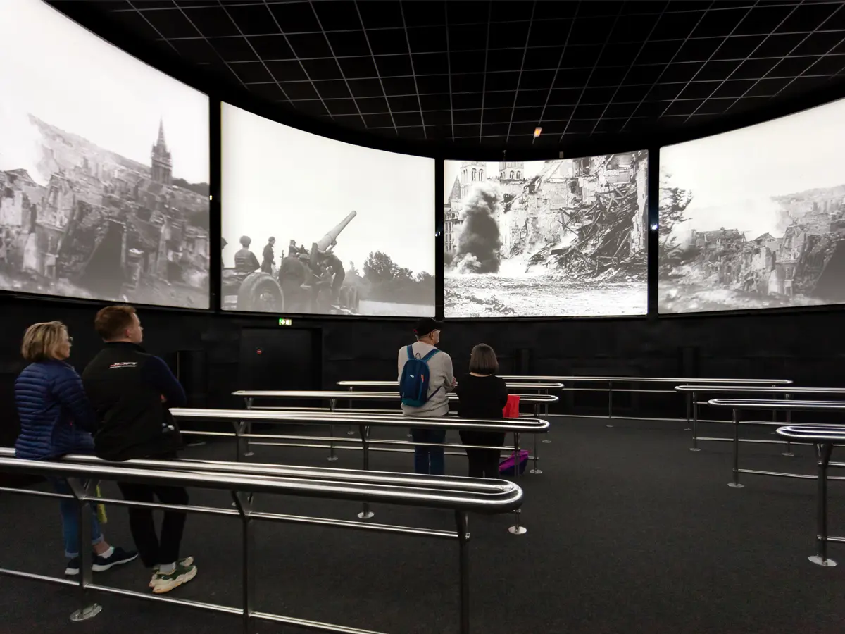 Nouveau film : ""Les 100 jours de la Bataille de Normandie"" Les images projetées sur neuf écrans proviennent d’archives britanniques, canadiennes, allemandes, américaines et françaises. Des deux côtés de la mer, on se préparait à ce choc tant attendu. Puis, malgré une météo défavorable, vint ce matin du 6 juin 44, le premier pas tant espéré de la libération de l’Europe occidentale. Des débarquements sur les 5 plages de la Manche et du Calvados au tragique bombardement du Havre le 12 septembre, la Bataille de Normandie a duré 100 jours. Vivez 20 minutes d’une pure intensité historique ! Afin d’améliorer votre confort, notre espace d’accueil est totalement réaménagé : des cartes, la chronologie et le bilan de la Bataille de Normandie sont présentés. Quelques objets militaires britanniques issus des collections du Mémorial de Caen sont également exposés. Ce film a été réalisé par la société Tempora et par le Mémorial de Caen. Il a été commandé et financé par la Région Normandie. Séance toutes les 30 min à l'heure et à 30 de chaque heure.