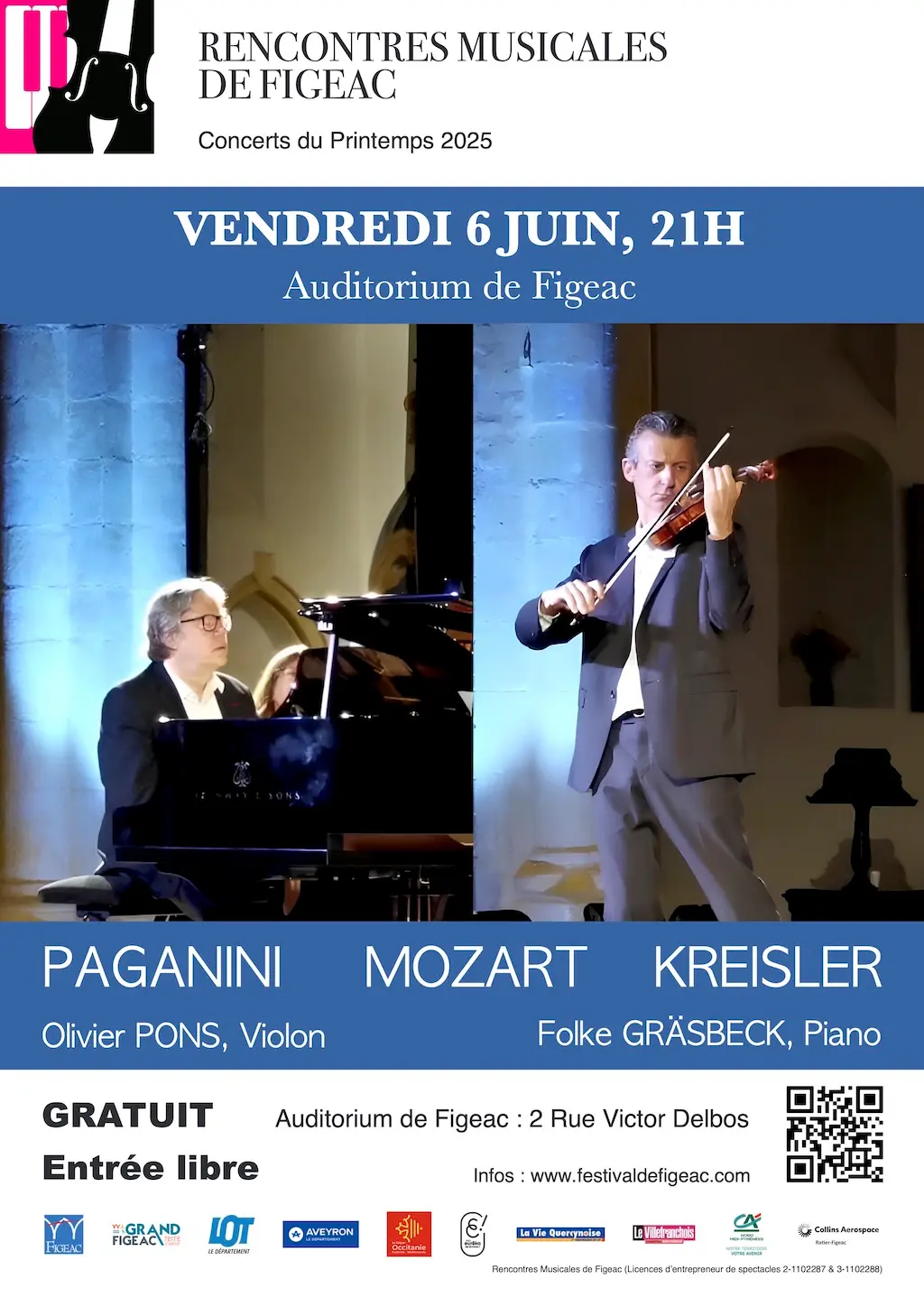 Olivier Pons et Folke Gräsbeck à l’Auditorium Oum Kalsoum Récital violon - piano Mozart, Paganini, Kreisler, etc. Bienvenue à tous !