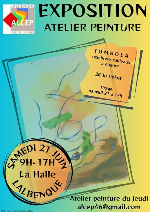 L'ALCEP vous invite à venir découvrir les toiles réalisées tout au long de l'année lors des ateliers peinture du jeudi. Tombola à 2 € le ticket. De nombreux lots sont à gagner. Le tirage au sort aura lieu à 17h00.