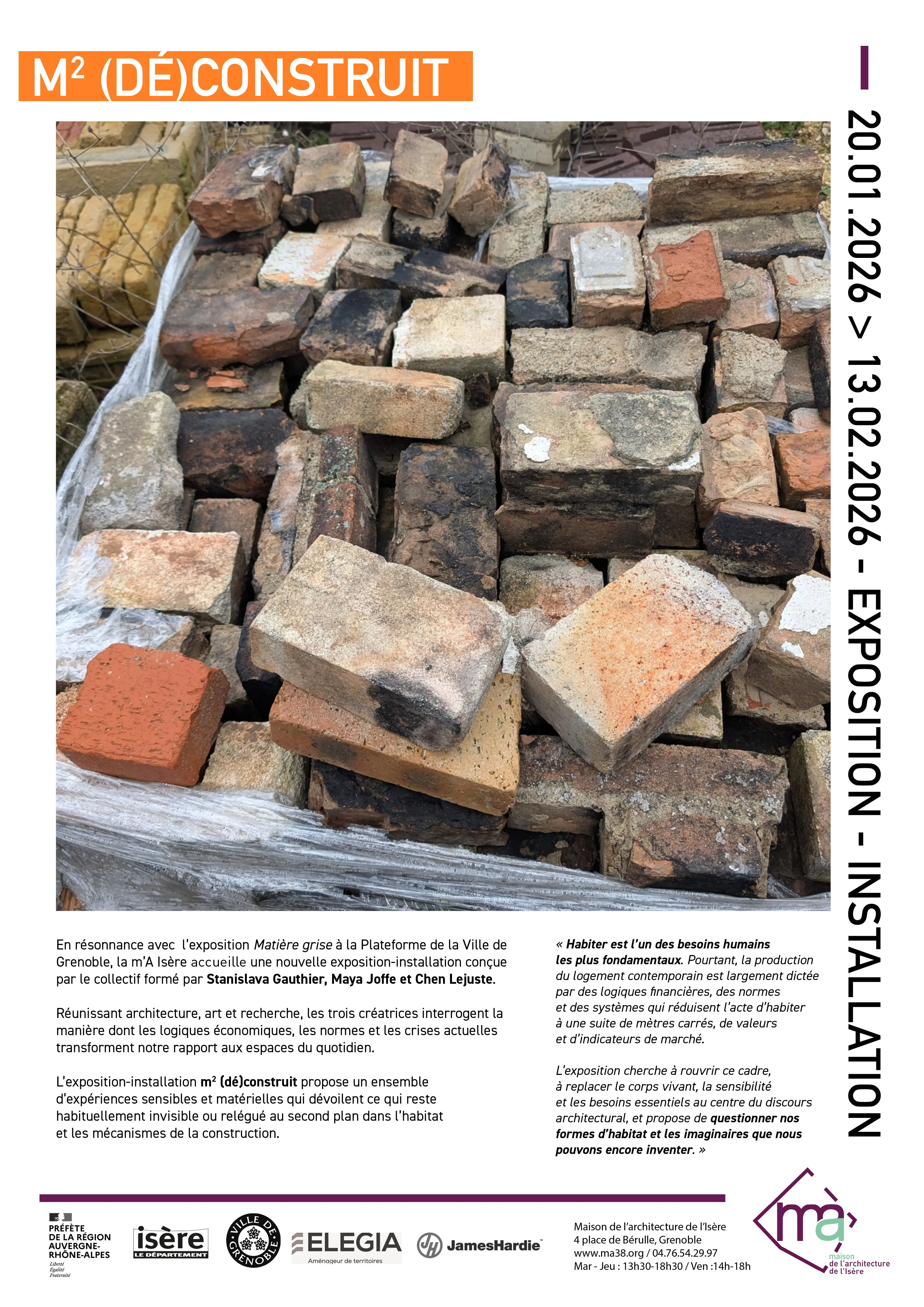 L’exposition « m² [dé] construit » a été réalisée avec la collaboration de ECOMAT38, association s'inscrivant dans l'économie circulaire du BTP visant à diminuer le gaspillage et les déchets sur les chantiers du bâtiment en développant les bonnes pratiques de réemploi.