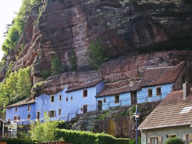 Entouré de forêts et dominé par d’imposantes parois de grès roses, Graufthal doit sa renommée à de curieuses habitations troglodytiques qui s’abritent au pied des falaises, des maisons uniques en Alsace.