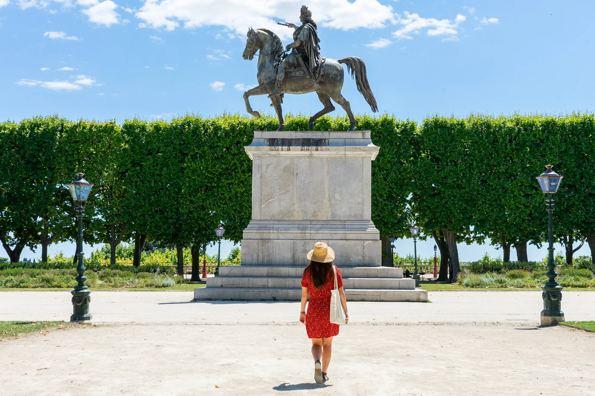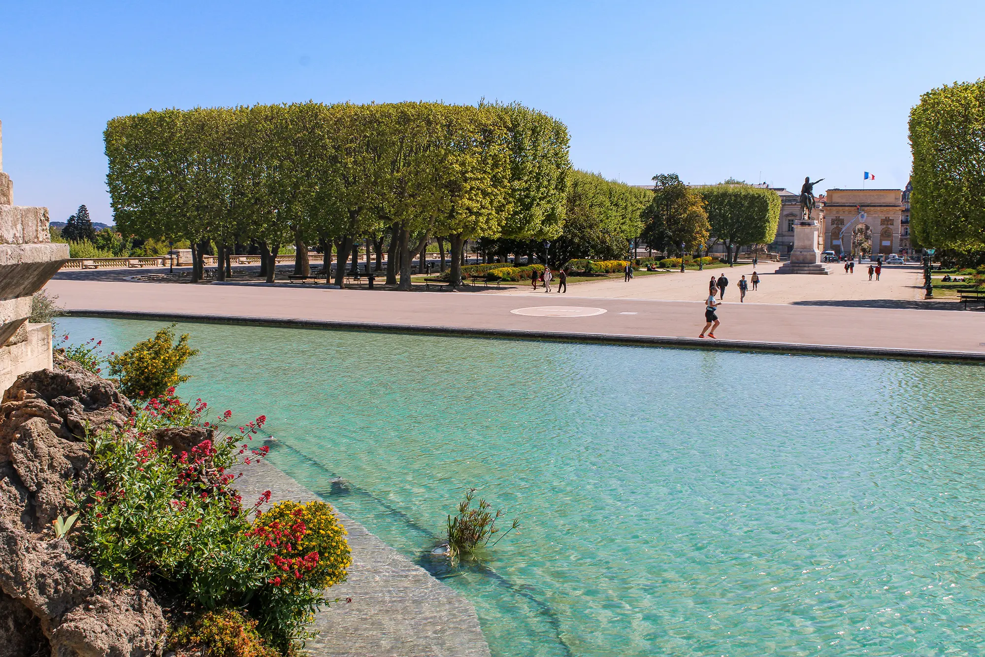 Place royale, la promenade du Peyrou, belvédère largement ouvert à tous les horizons, accueille une statue équestre de Louis XIV, dont Jean Giral, l’architecte, mènera à terme la réalisation en 1774. Elle contient également Château d'eau conçu au XVIIIè siècle. Cette place située à la périphérie de l'Ecusson est l'un des lieux de prédilection des Montpelliérains. L'arc de triomphe et le château d'eau que prolonge l'aqueduc, constituent des modèles d'architecture classique. Chaque dimanche matin, le parc du Peyrou accueille une brocante.
