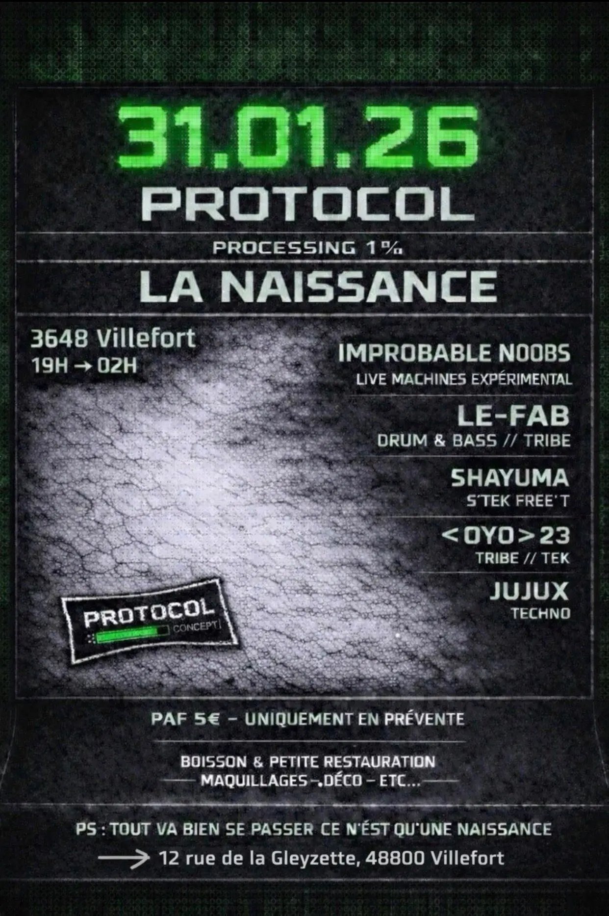 Tarif : 5 € - Uniquement en prévente : https://www.helloasso.com/.../evene.../protocol-la-naissance