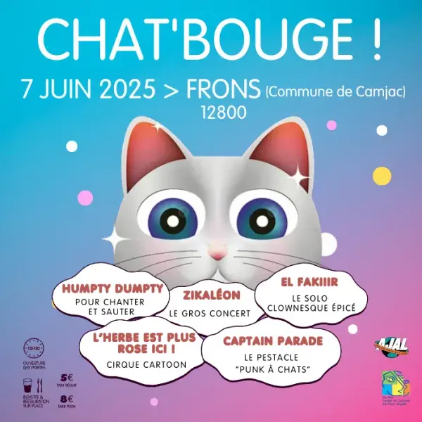 Ce rendez-vous, devenu incontournable dans le Pays Ségali, est né de la complicité entre le Centre Social et Culturel du Pays Ségali et l'AJAL. Deux associations engagées, ancrées localement, qui partagent les mêmes valeurs d'éducation populaire et de lien social. Depuis 2022, elles unissent leurs forces pour faire vivre Chat'Bouge, un temps fort dédié aux habitants et aux familles du territoire. Au programme : 16h : El Fakiiir (dès 5 ans) - Le solo clownesque épicé 16h45 : Humpty Dumpty (dès 6 ans) - Pour chanter et sauter 17h45 : L'Herbe est plus rose ici ! (tout public) - Cirque Cartoon 18h30 : Captain Parade (dès 6 ans) - Le pestacle de "Punk à chats" 20h : Zikaléon (tout public) - Le gros concert