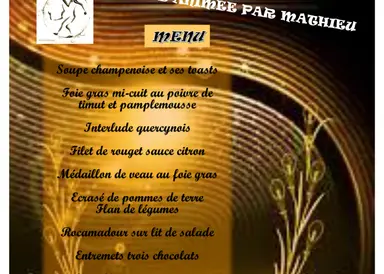 Menu : punch et ses toasts, tourin Périgordin, foie gras et sa garniture, gratin de queue de langoustine, trou périgourdin, chapons, galettes de pommes de terre cèpes, cèpes et fromage, dessert de Noël