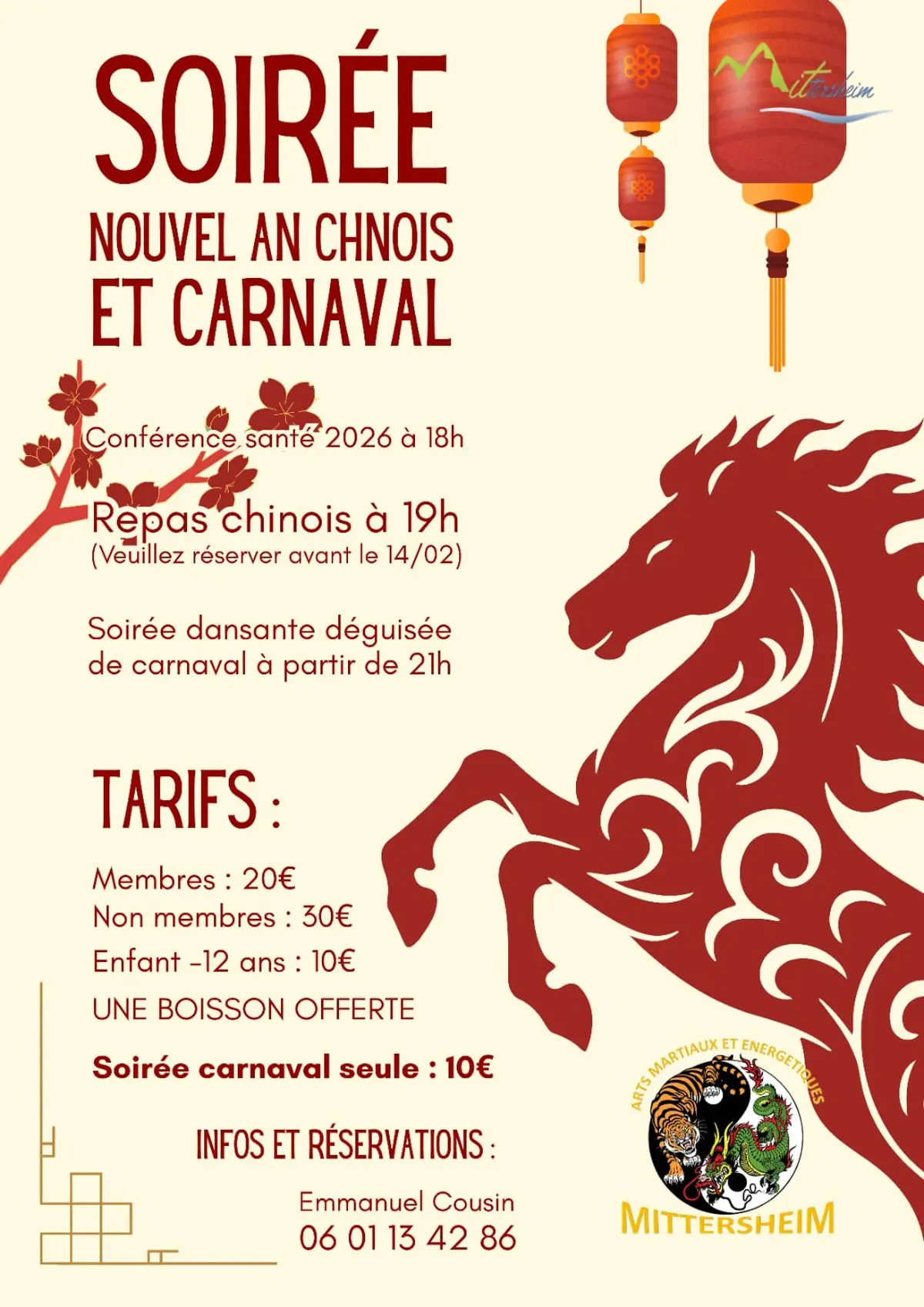 Au programme : conférence sur la nouvelle année et le printemps, suivie d'un repas traditionnel chinois (sur réservation par téléphone avant le 14 février). Après le repas, place à la soirée dansante déguisée pour le carnaval. Venez déguisés !