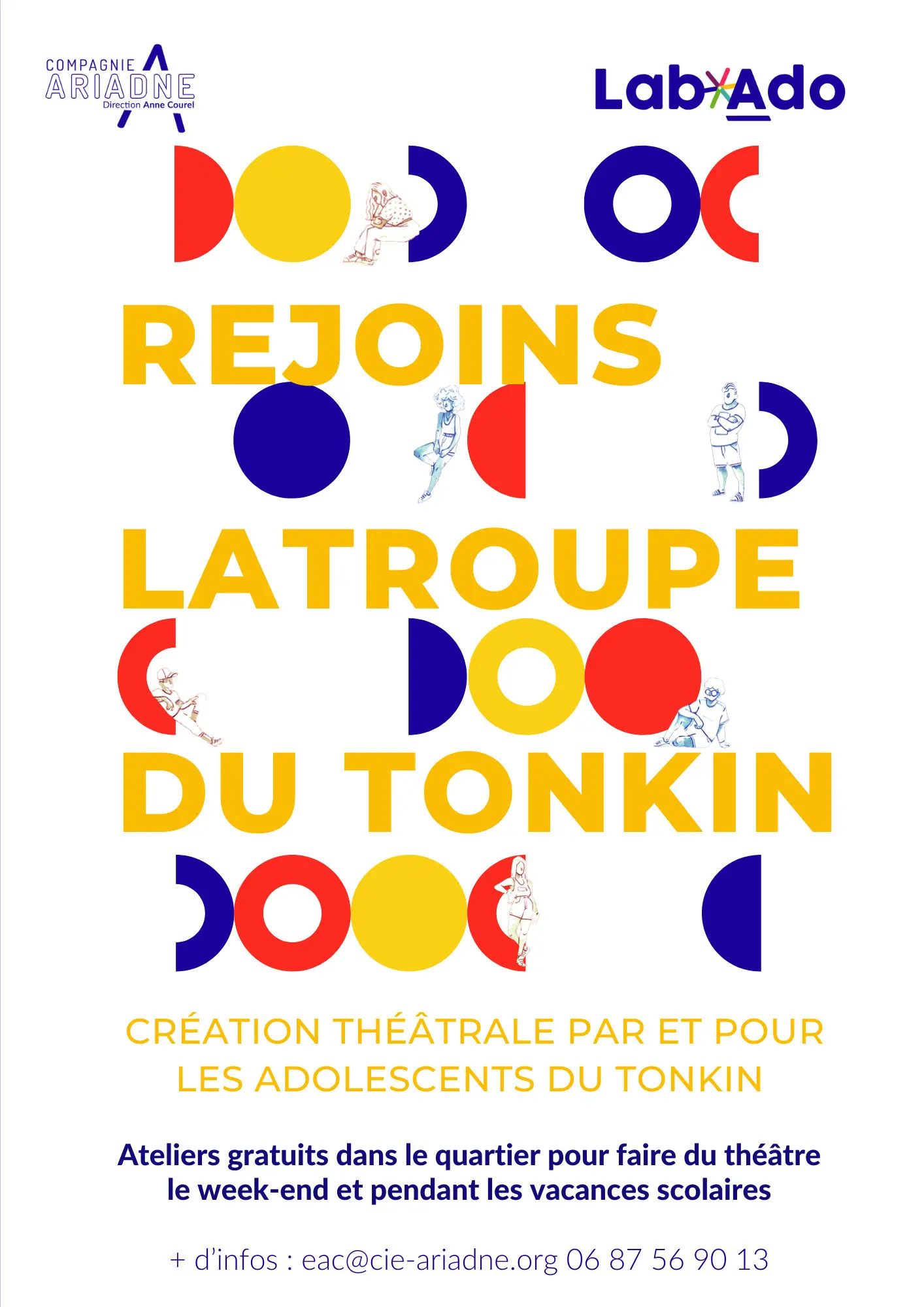 Vous avez entre 11 et 20 ans ? Le monde du spectacle vivant vous intéresse ? Vous aimez créer, écrire, jouer, danser ? vous voulez prendre la parole, rencontrer d’autres ados et participer aux activités d’une compagnie de théâtre professionnelle ? Rejoignez la Troupe du Tonkin ! Une aventure théâtrale complète encadrée par des comédiennes et comédiens de la compagnie Ariadne.