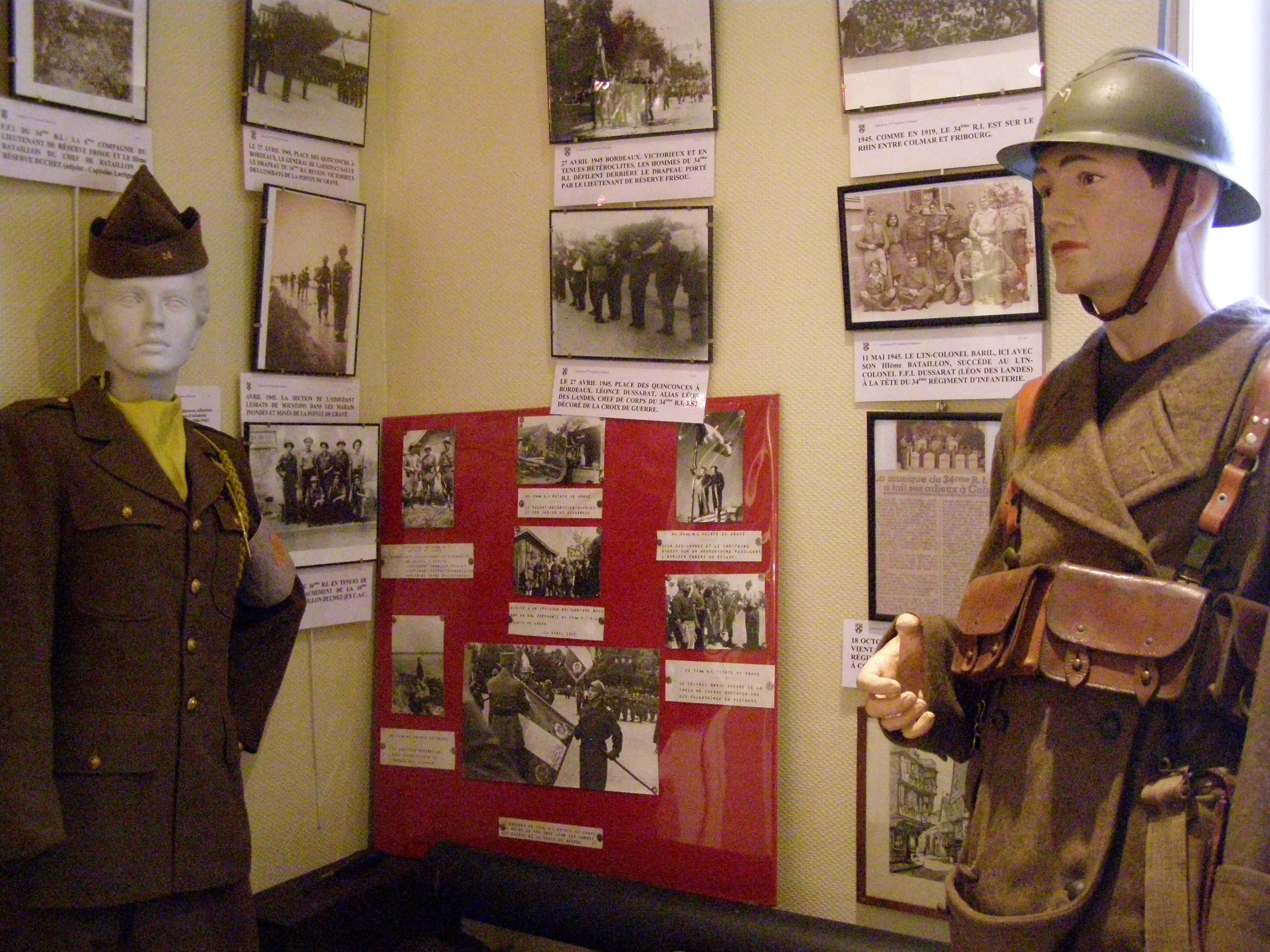 Créé par les bénévoles de l'Amicale du 34ème RI, le musée conserve la mémoire du régiment le plus populaire des Landes et en perpétue le souvenir à travers de nombreux documents ( affiches, drapeaux, matériel de guerre...). Il s'adresse à toutes les personnes désireuses de connaître la vie des hommes au sein des régiments de Mont de Marsan (34e RI, 234e RI et 141e RIT) en particulier durant les deux guerres mondiales.