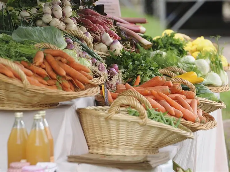 Produits bio et locaux avec présence de producteurs : légumes, bières, fromages, miels, pains, viandes, jus de pommes.