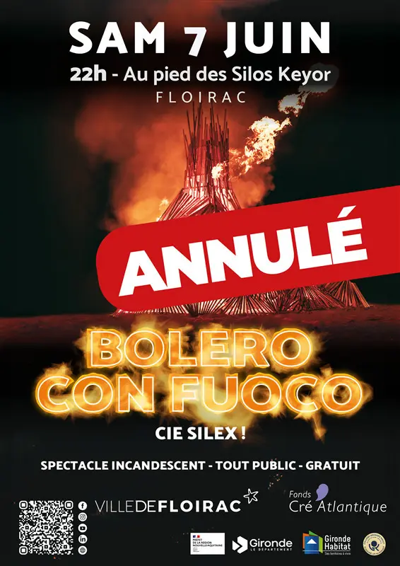 Pour des raisons indépendantes de notre volonté et malgré un engagement sans faille des équipes artistiques, culturelles et techniques, nous sommes contraints d'annuler la manifestation « Bolero con Fuoco », initialement prévue le samedi 7 juin au pied des silos Keyor à Floirac.