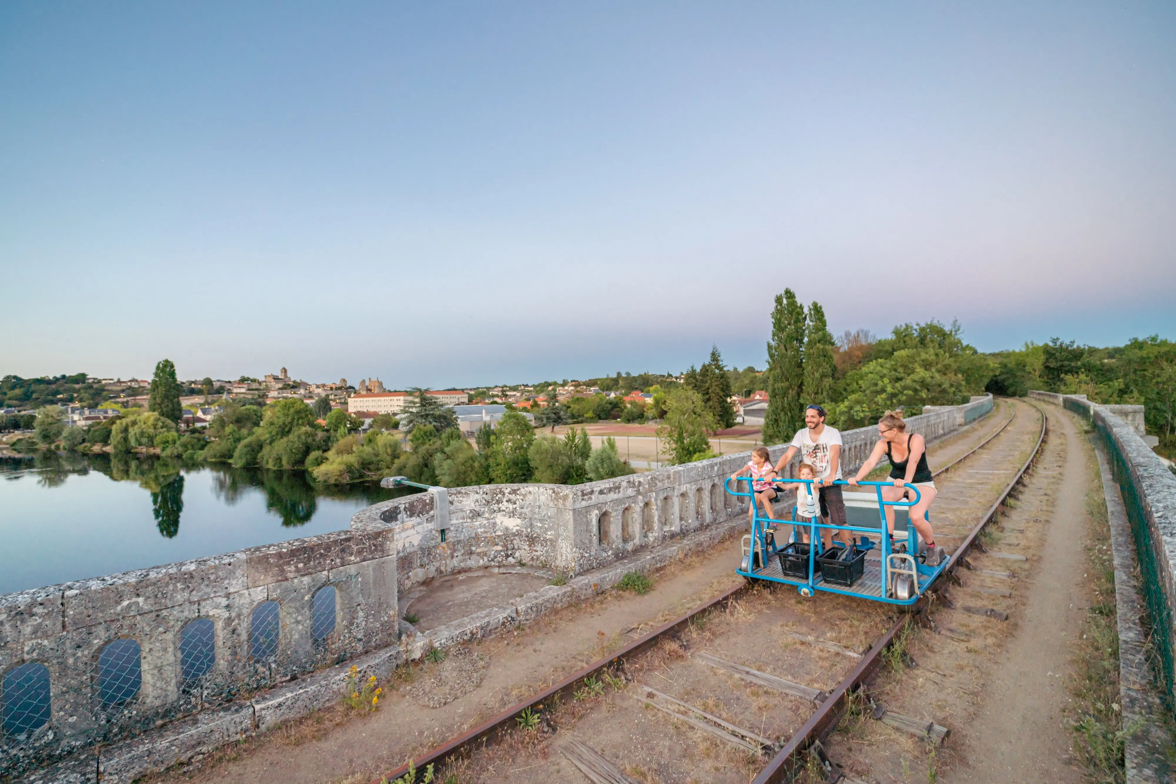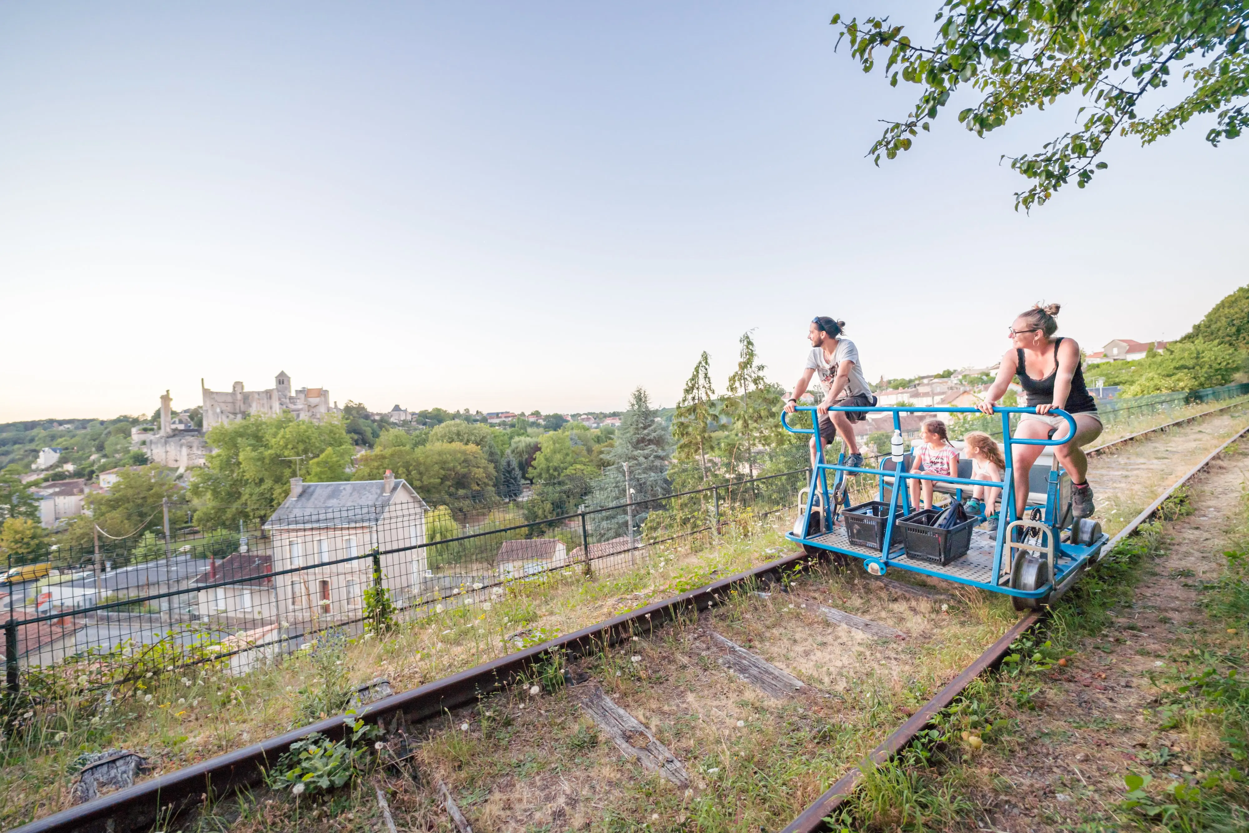 Plein est de Poitiers, la cité médiévale de Chauvigny mérite une visite. Et si celle-ci prenait la forme d'une balade en vélorail ? À deux, en famille ou entre amis, partez pour 17 km ou moitié moins (aller-retour), 1 à 2h à bord d'un engin insolite parcourant l'ancienne voie ferrée, servant autrefois notamment au transport des belles pierres des carrière du pays chauvinois. Vous pédalez à travers le bocage vallonné, découvrez à l'aide d'une roadmap le patrimoine de la région, traversez ponts, passerelles et viaducs, dont celui offrant une vue impressionnante des châteaux et de la collégiale Saint-Pierre de Chauvigny. En juillet et août, optez pour les Crépusculaires, au soleil couchant, ou le Dîner du Viaduc, pour un repas dans un cadre exceptionnel au-dessus de la Vienne.