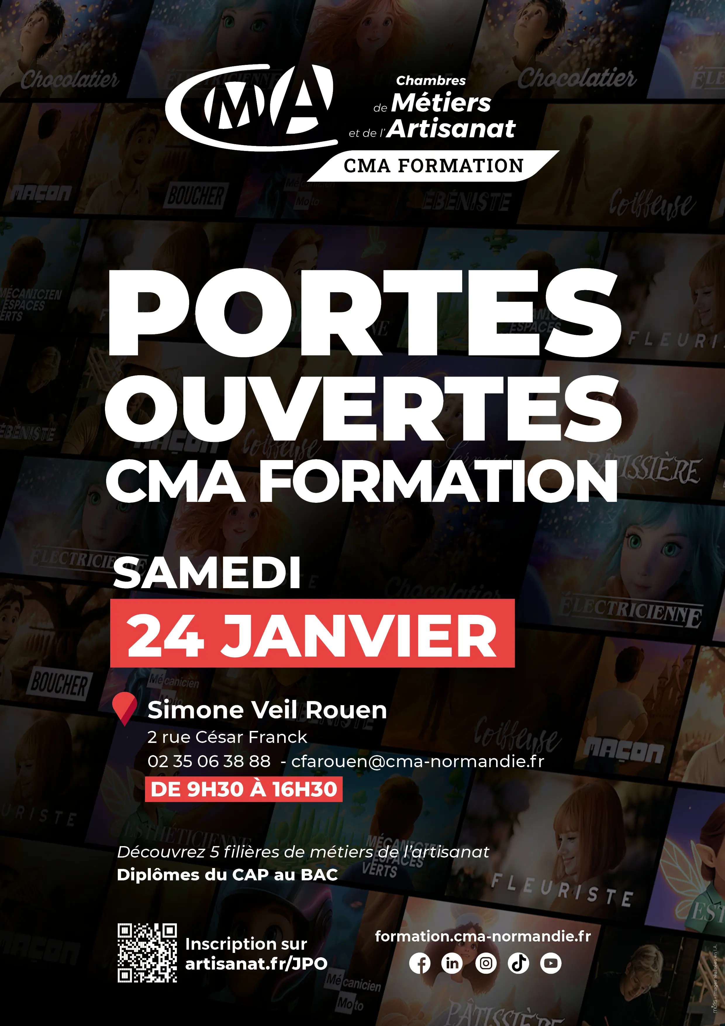 Le 24 janvier, viens découvrir les métiers lors de nos portes ouvertes, organisées dans près de 150 centres en France. En Normandie, nos établissements t’accueillent de 9h30 à 16h30 à Caen, Coutances, Rouen, Dieppe et Le Havre. Au programme : visites des ateliers, échanges avec les formateurs et les apprentis, découverte des parcours possibles et immersion dans les métiers. Une occasion idéale pour tester, comprendre et choisir ton futur métier.