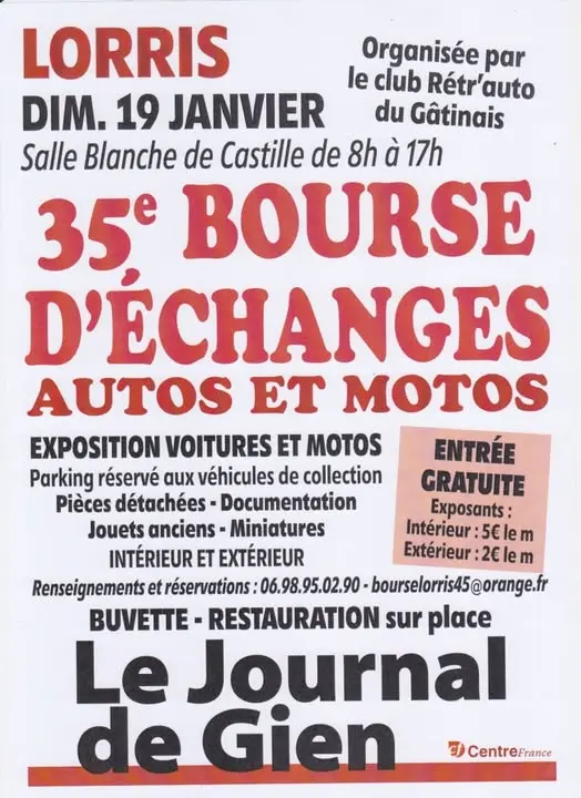Le club Retr'auto du Gâtinais organise sa 36 ème bourse d'échanges autos et motos. Parking réservé aux véhicules de collection. Exposition de voitures et de motos. Pièces détachées, documentation, jouets anciens, miniatures, intérieur et extérieur. Buvette et restauration sur place. Entrée gratuite. De 8h à 17h.