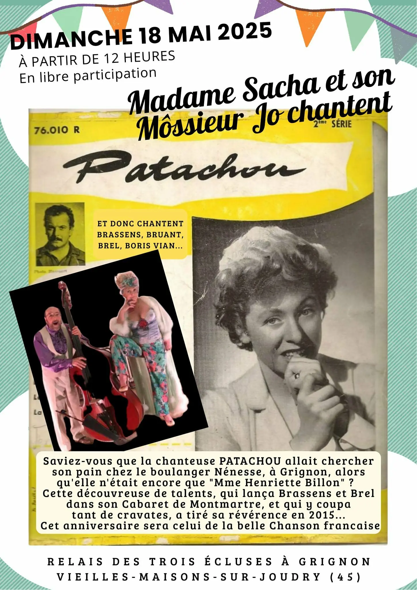 Déjeuner musical au Relais des trois écluses. Avec Madame Sacha et son Môssieur Jo chantent "Patachou" (Brassens, Brel, Bruant...). N'oubliez pas la lecture de "Raboliot" à 16h de M. Genevoix conté par F. Pascal (une collaboration avec la Communauté de Communes).