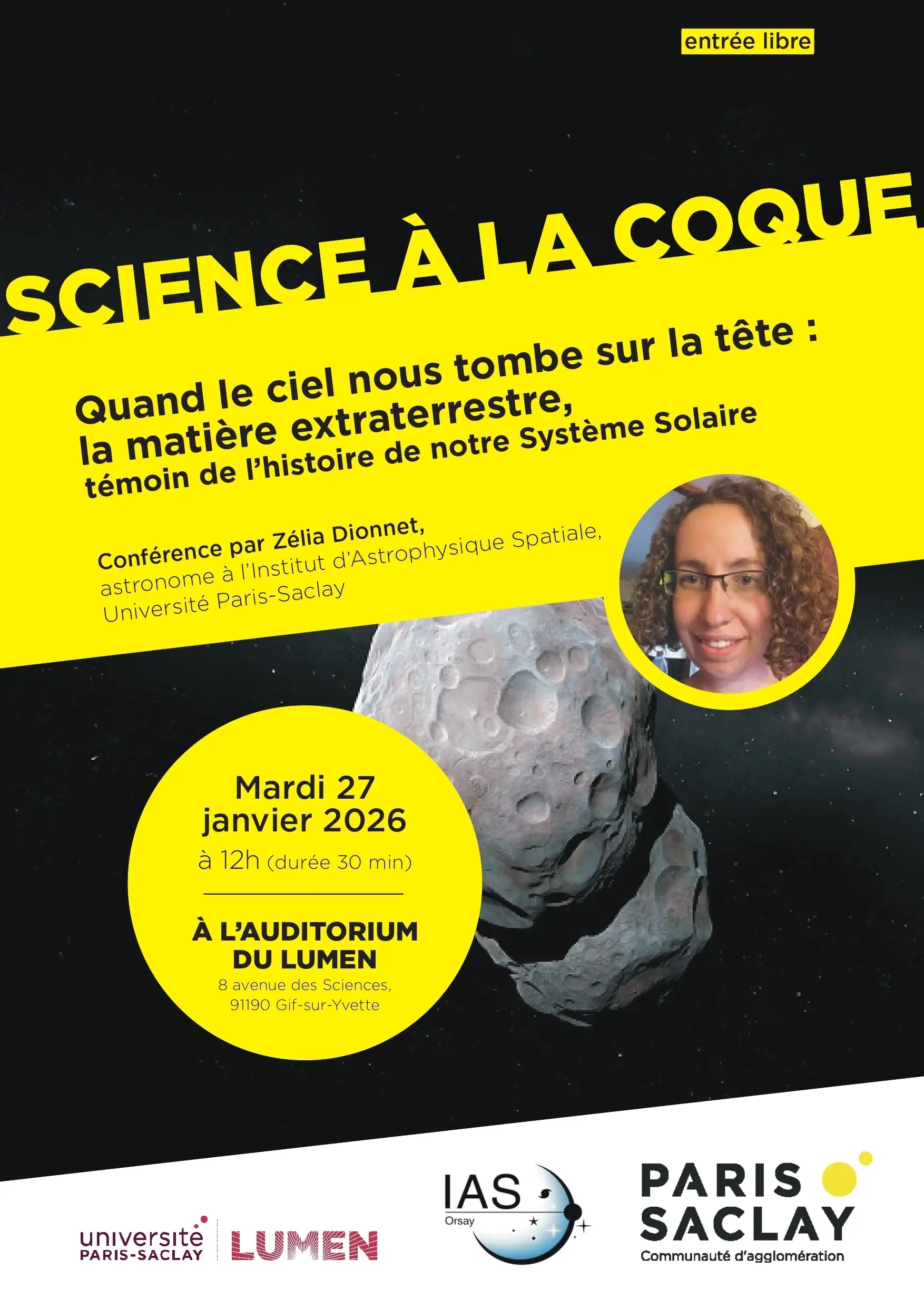 D’où viennent précisément ces échantillons ? Quelles techniques de pointe permettent d’en extraire des informations sur des échelles de temps de plusieurs milliards d’années ? Et comment ces petites poussières venues de l’espace nous aident-elles à mieux comprendre nos propres origines ? Autant de questions que cette conférence abordera à travers un voyage entre menace céleste et enquête scientifique sur la genèse de notre Système solaire.