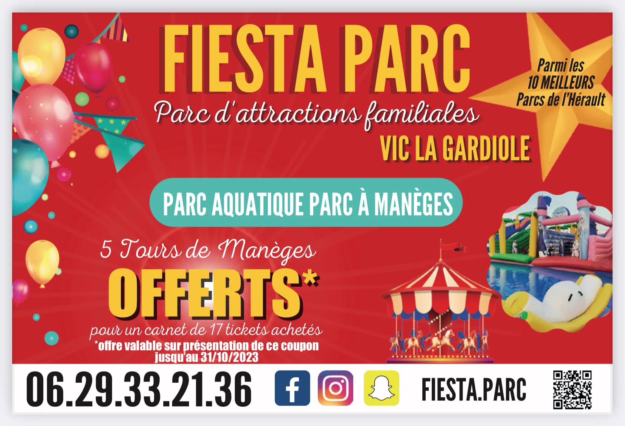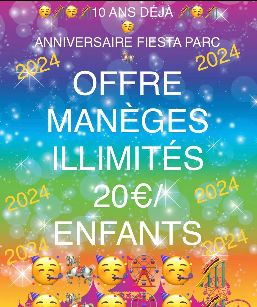 Fiesta parc est un Parc d'attraction et aquatique familial, situé sur la commune de Vic la Gardiole sur le bassin de Thau avec des attractions pour petits et grands ouvert de mars à septembre. Vous retrouverez tous nos horaires et tarifs sur notre site. Venez passer une journée d'exception en famille, dans ce parc en plein air entre de Sète et Montpellier. Les attractions sont accessibles pour les enfants de 1ans a 14ans, mais toute la famille pourra se divertir sur ce parc a entrée libre. Et pour prolonger ce moment venez fêter l'anniversaire de vos enfants a fiesta parc, toutes nos formules sont disponible sur notre site internet.