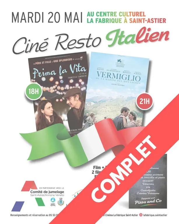 20h : repas préparé par « Pizza and Co » (salade italienne, Penne Massimo, tiramisu). Vin offert par le Comité de Jumelage St-Astier / Annone Veneto