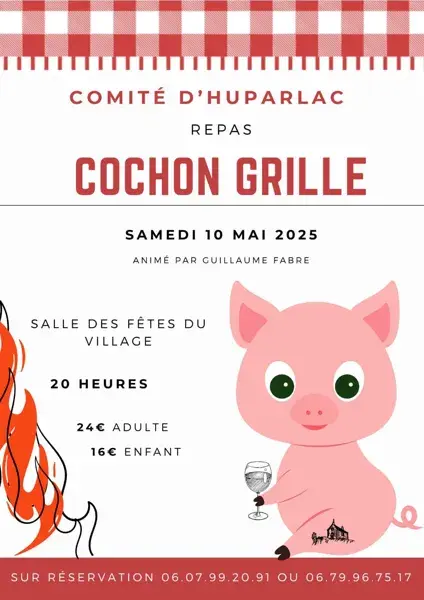 Repas cochon grillé à 20h à la salle des fêtes d'Huparlac, animé par Guillaume Fabre. Réservations au 06 07 99 20 91 ou au 06 79 96 75 17