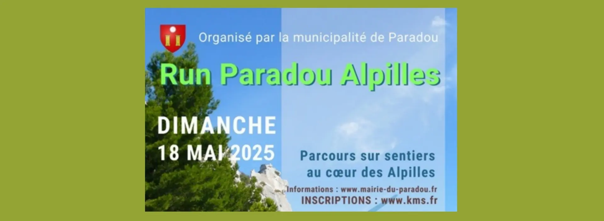 La 9eme édition du Run Paradou Alpilles course pédestre, est organisée le dimanche 10 Mai 2026 sous l’égide de la Mairie du Paradou. La course est organisée par le comité des sports de la mairie de Paradou et la société KMS. Deux parcours de course sur 7 et 12,8 km sur les magnifiques sentiers des Alpilles ainsi qu’une marche sur le petit parcours sont prévus. Ils font de la un rendez vous annuel sportif et festif incontournable, pour les Paradounais comme pour les amoureux du sport.