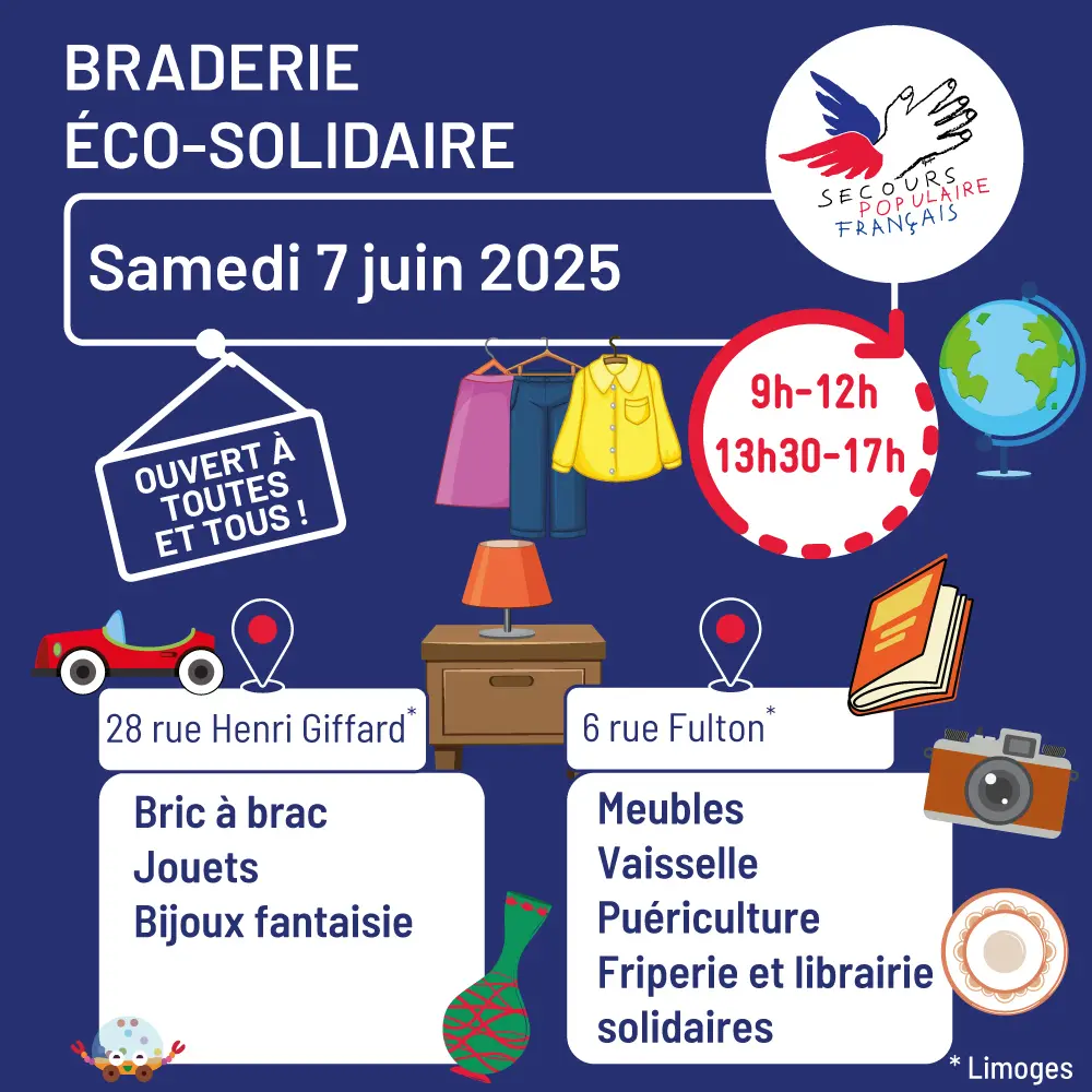 Les espaces de vente du Secours Populaire en Zone Nord à Limoges seront ouverts le samedi 7 juin 2025 de 9h00 à 12h00 et de 13h30 à 17h00.