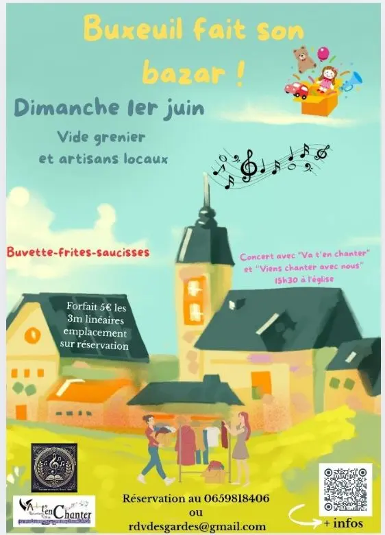 Les rendez-vous de la salle des gardes, en partenariat avec la chorale "va t'en chanter" organise un vide grenier toute la journée agrémenté d'un concert à l'église de Buxeuil à 15h30.