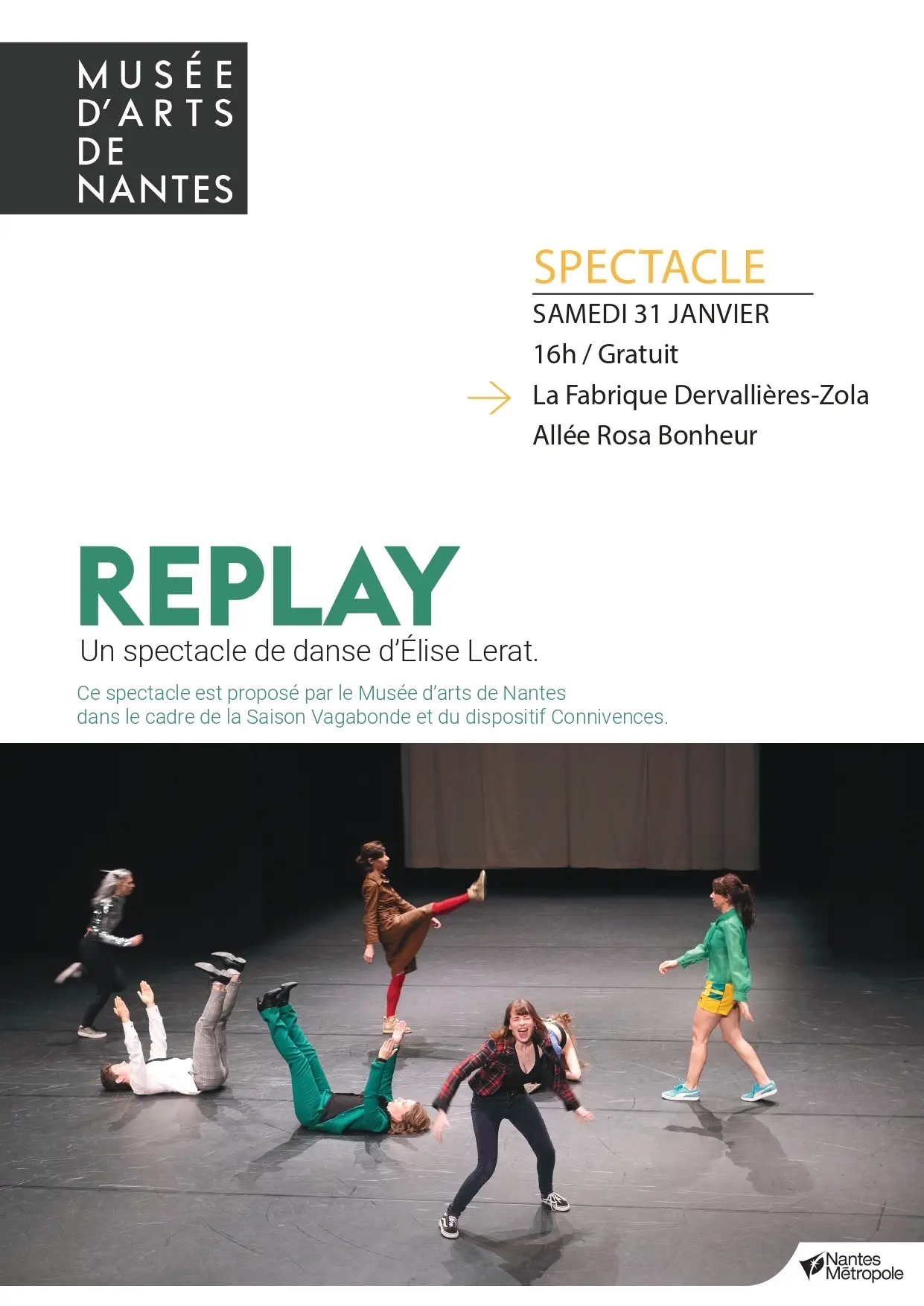 Élise Lerat, chorégraphe, entraîne un groupe de danseuses et danseurs amateurs à rejouer des images, des émotions, des gestes et des sensations du cinéma. Pendant l’exposition Sous la pluie. Peindre, vivre et rêver au musée, elle présente Replay, une performance où l’écran devient espace de jeu : le cinéma se met en corps. Entre émotions et sensations, Replay sonde l’empreinte du cinéma en nous — comment un plan, une pluie, une chanson façonnent notre manière de bouger, de ressentir et de regarder. De l’inoubliable Chantons sous la pluie à d’autres références, la mémoire du corps se réveillera et les souvenirs reprendront vie et mouvement. On regardera, on ressentira, et ça restera !